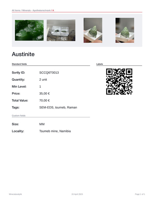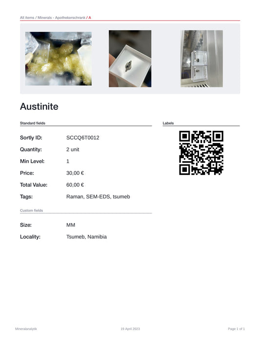 Austinit - Austinite Tsumeb mine, Tsumeb, Namibia - XRD & EDX untersucht