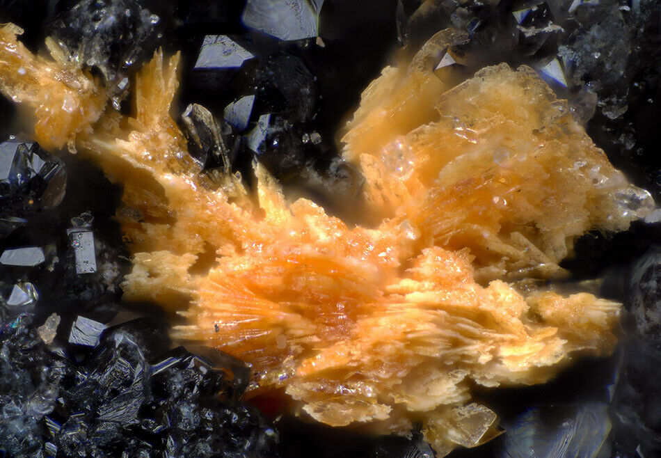 Orange bismutit aggregates on dark quartz crystals from Reichenbach.