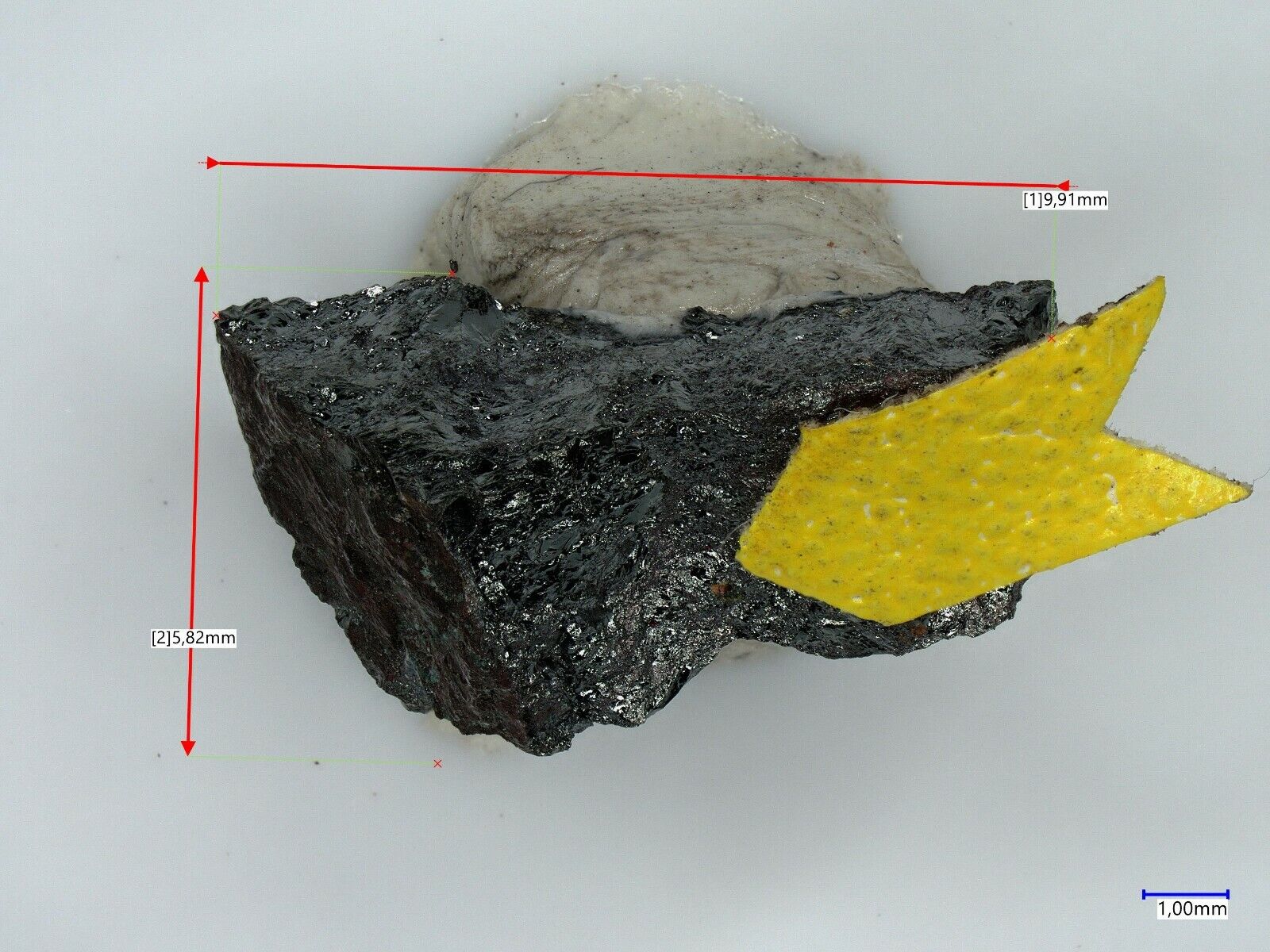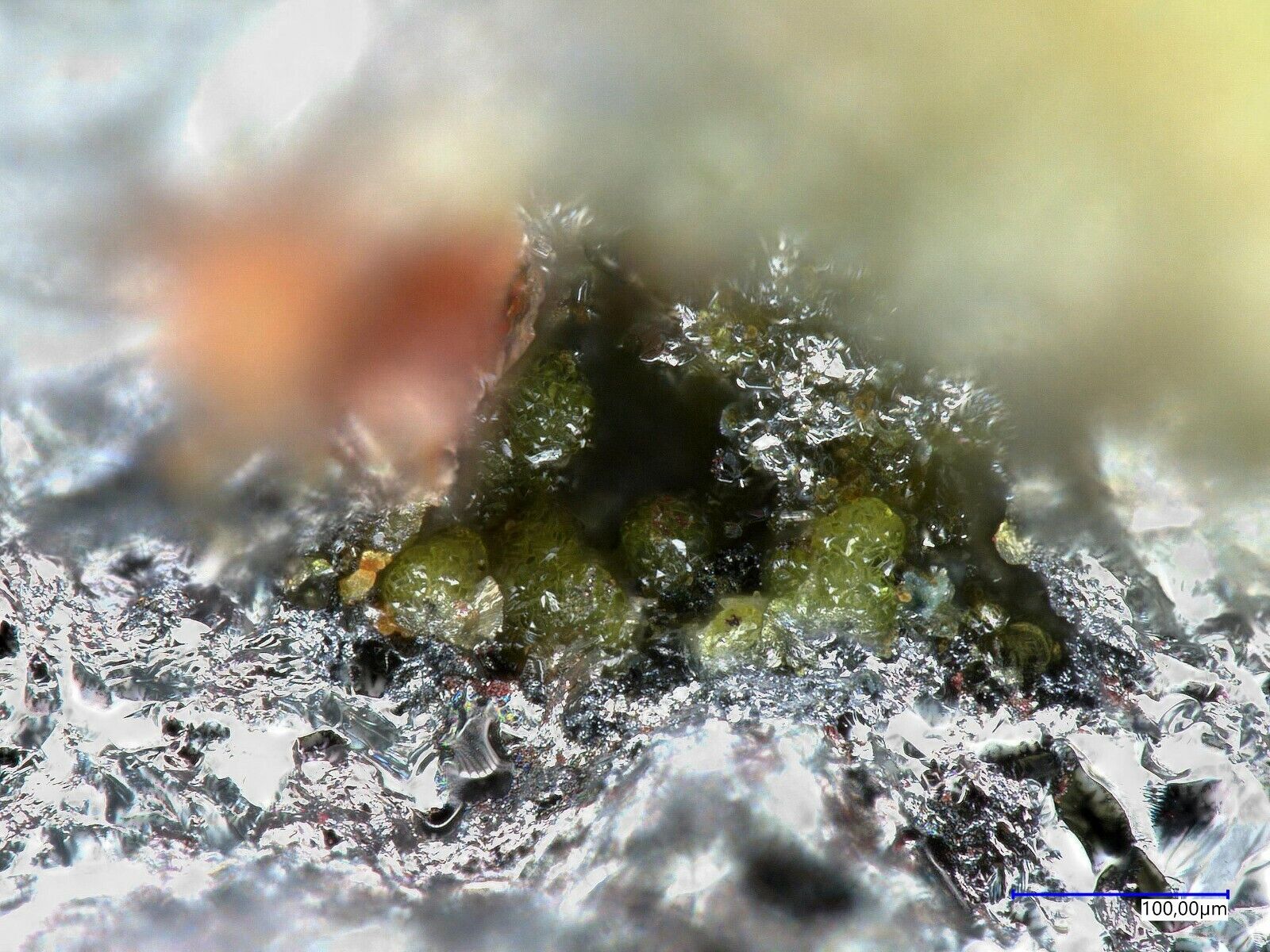 Olivgrün-gelbe Corkit-Kristalle in Germanitmatrix von der Tsumeb mine, Tsumeb, Namibia. EDX untersucht Nr 03-13-ge5. Größe 1.0 x 0.6 x 0.5 cm