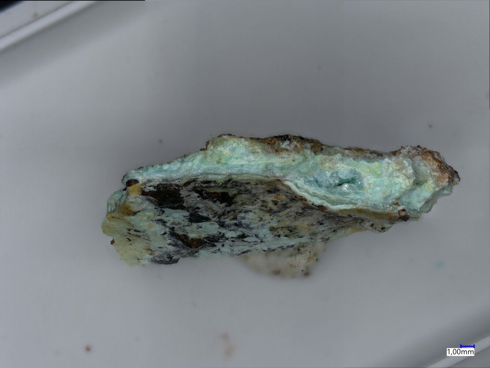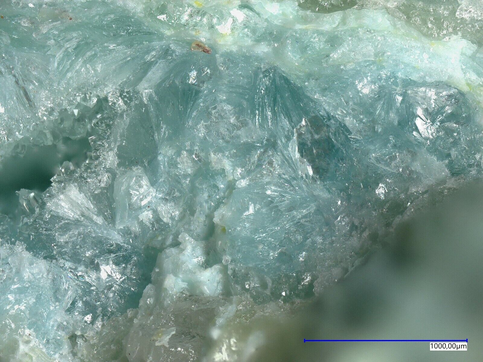 Hellblaue gelagerte Plumbophyllit-Kristallgruppen mit Quartz von der Blue Bell mine, ZZyzx, Kalifornien, USA. Größe: 3.2 x 2.2 x 0.6cm