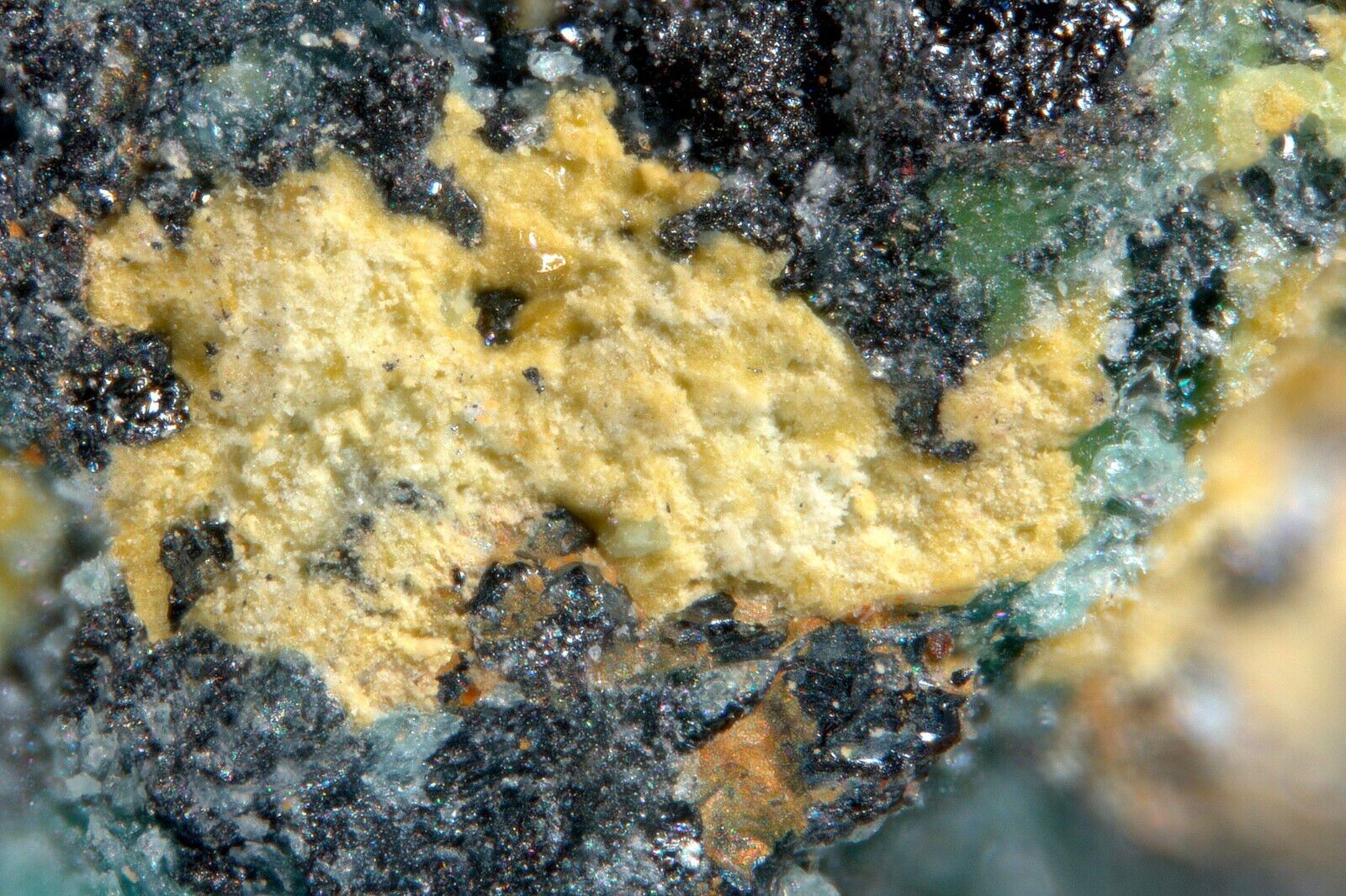 EDS & Raman verified yellow tredouxite with black trevorite and green willemseite