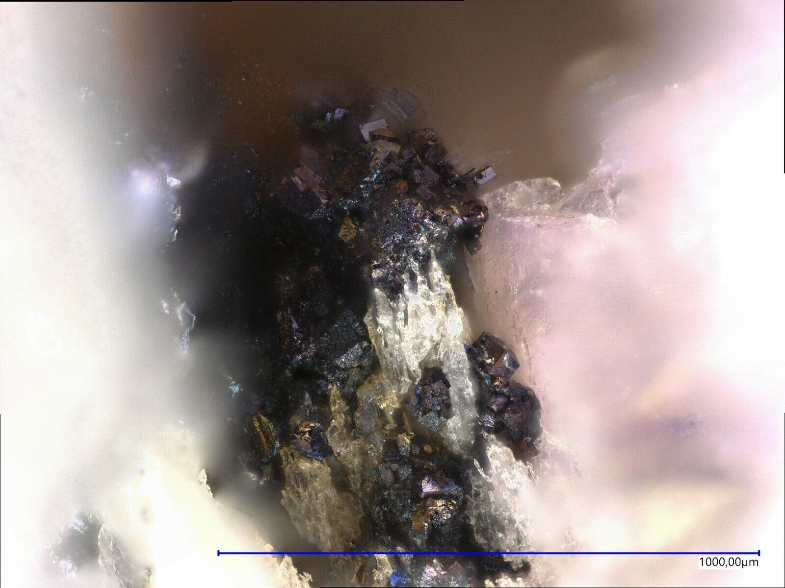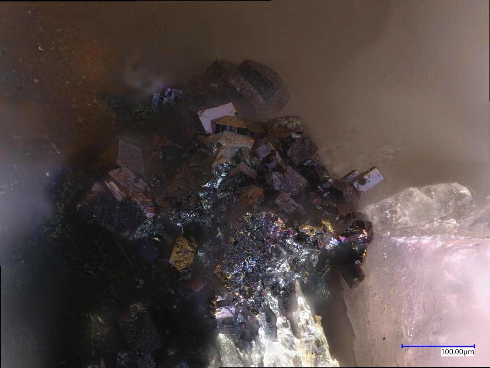 Purple tarnished Argentopyrite with proustite and rammelsbergite (dendritic), EDS & XRD confirmed no u134a-e & XRD no 239 from the Uranus mine, Kleinrückerswalde, Germany. Specimen size is 5.3 x 4.8 x 1.9 cm