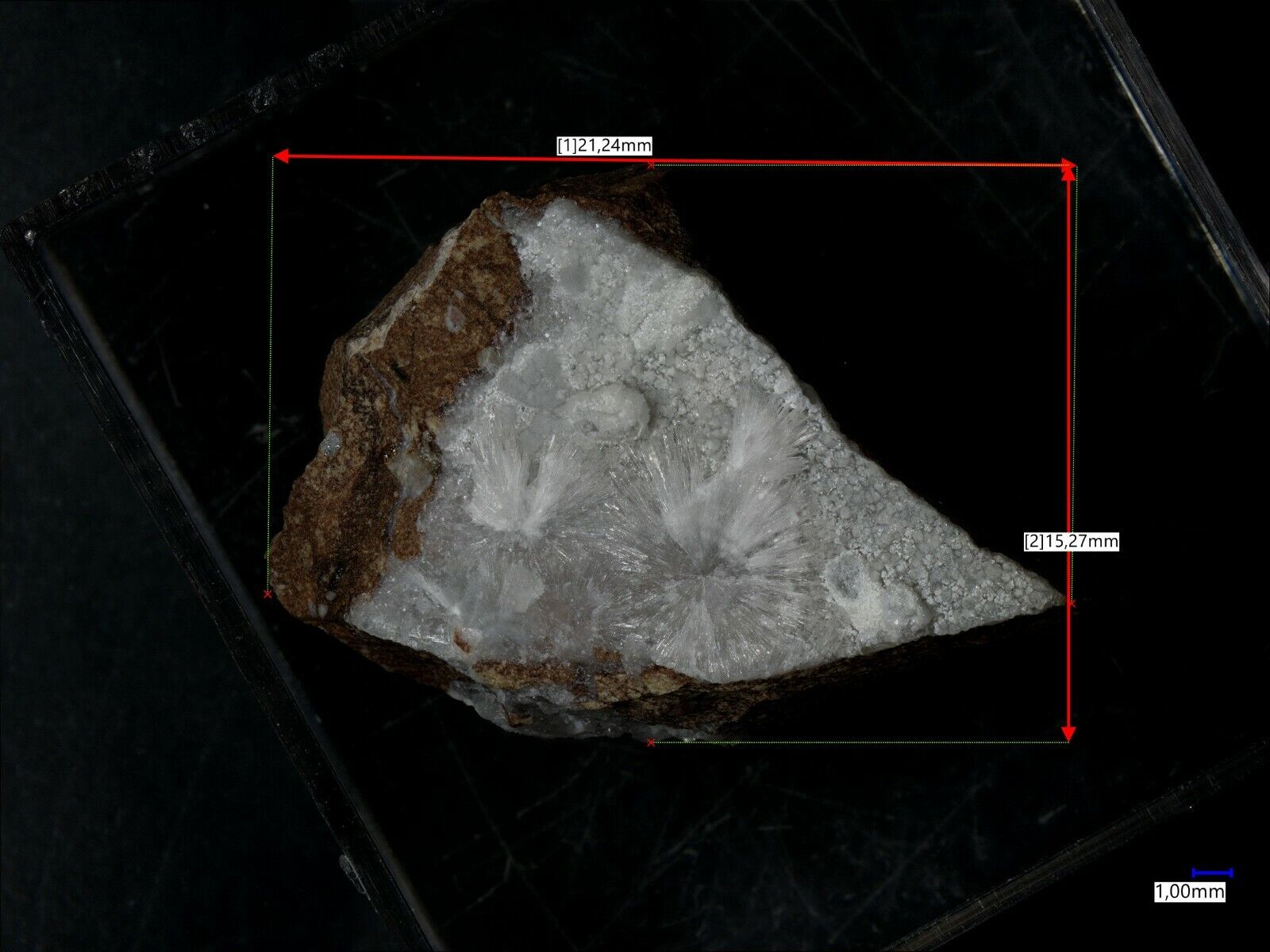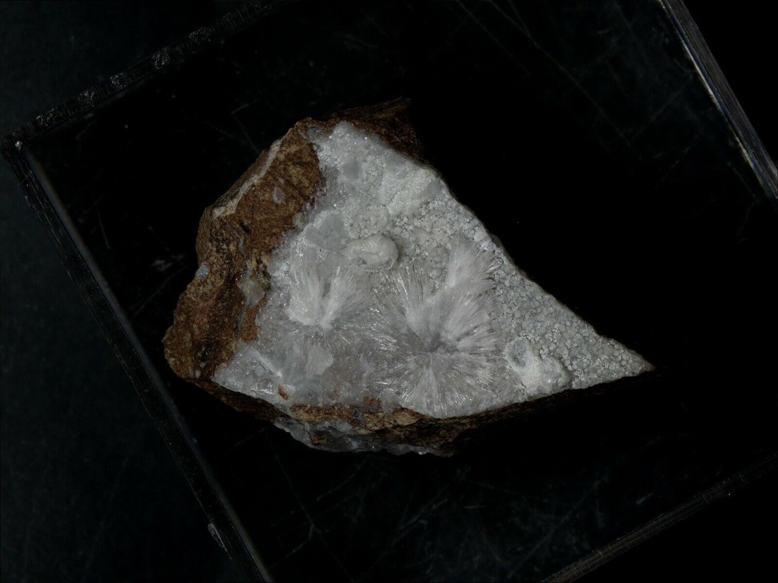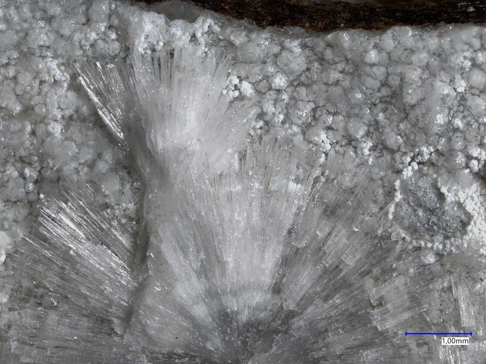 Farbloser Brenkit in flach-liegenden radialen Aggregaten von Schellkopf, Brenk, Deutschland.