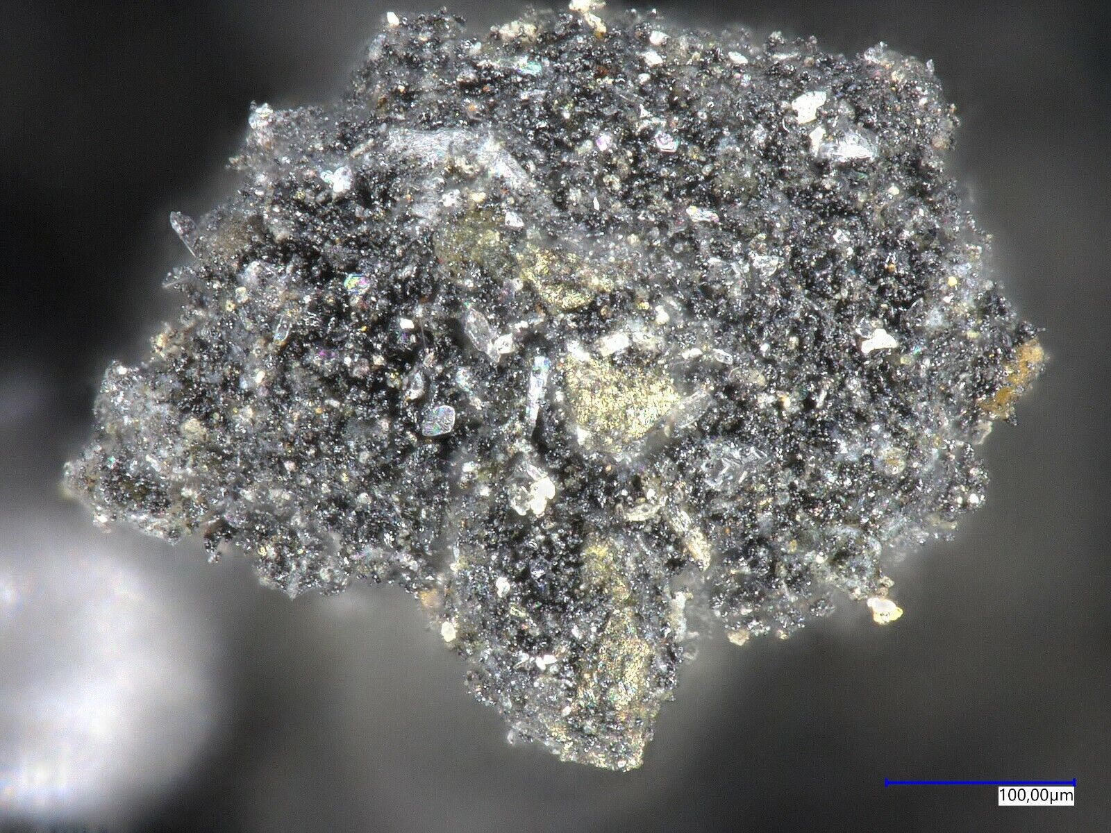 Black rounded cadmoselite on carbon pad. EDS analysed material no xv-13 from Ust Uyok deposit, Turan, Tuva, Russia. Specimen size is 0.9 x 0.9 x 0.3 cm (carbon pad size).