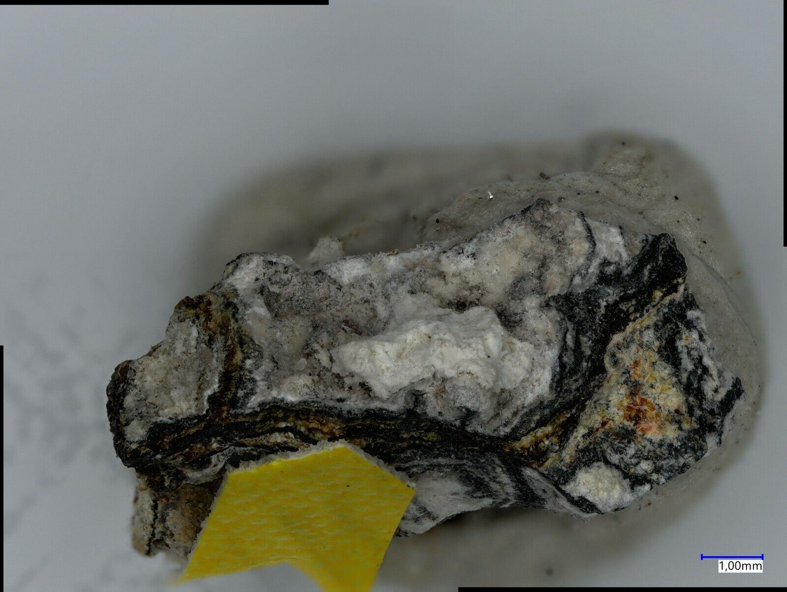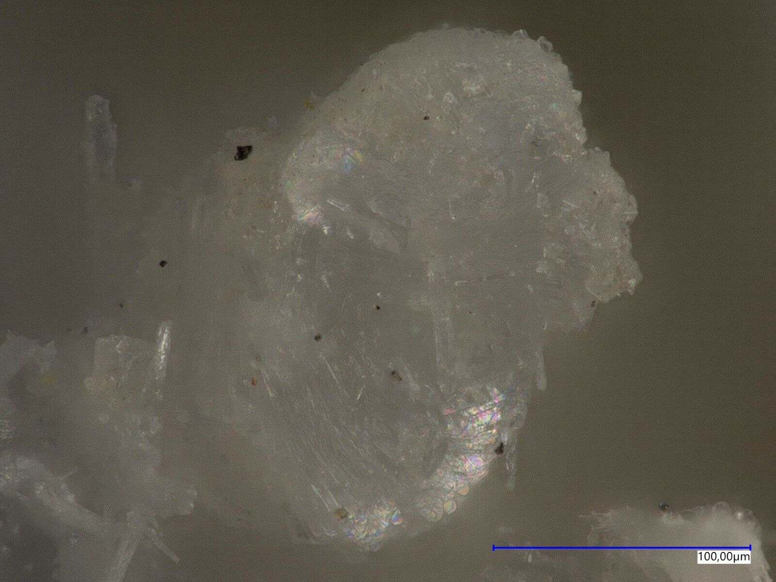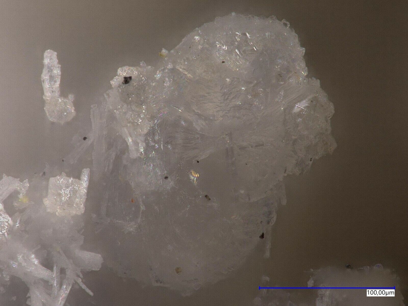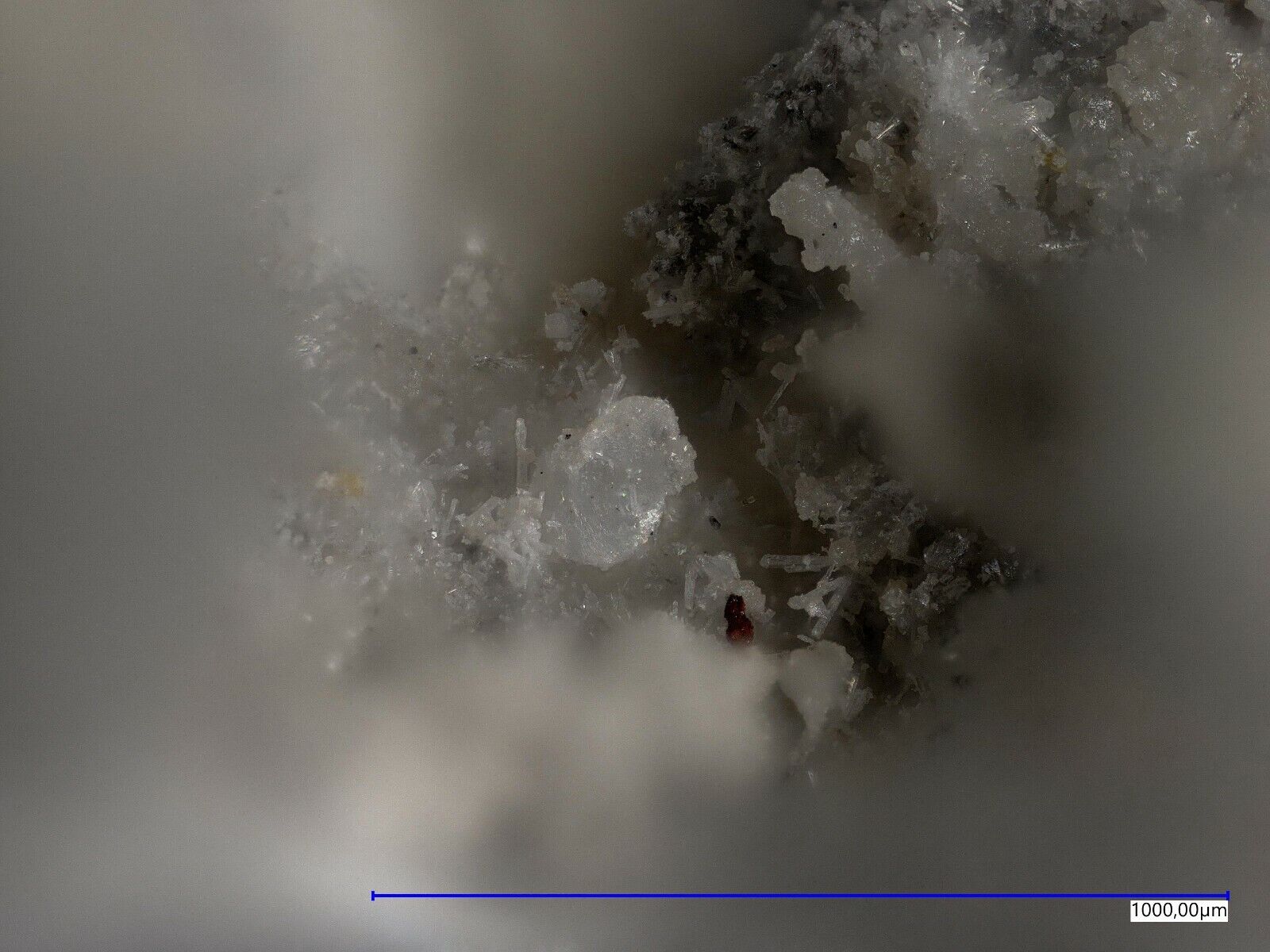 Colourless camanchacaite with Torrecillasite and arsenolite from the Torrecillas mine, Iquique, Chile. EDS analysed no 737, Analysis on request. Specimen size is 1.0 x 0.7 x 0.6 cm