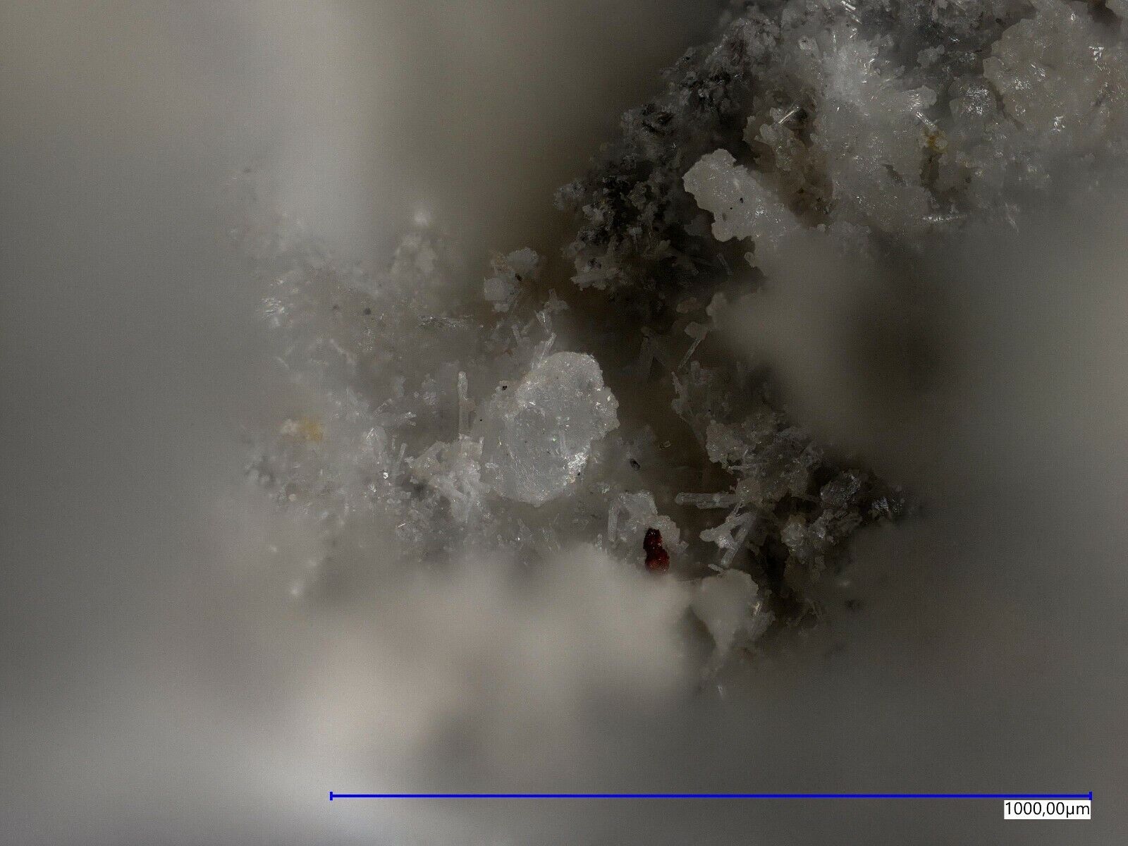 Colourless camanchacaite with Torrecillasite and arsenolite from the Torrecillas mine, Iquique, Chile. EDS analysed no 737, Analysis on request. Specimen size is 1.0 x 0.7 x 0.6 cm