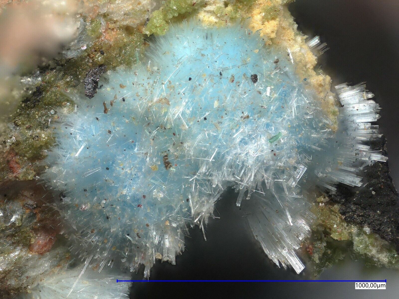Bluish dundasite with black coronadite from the Tsumeb mine, Tsumeb, Namibia. SEM-EDS confirmed. Analysis on request.