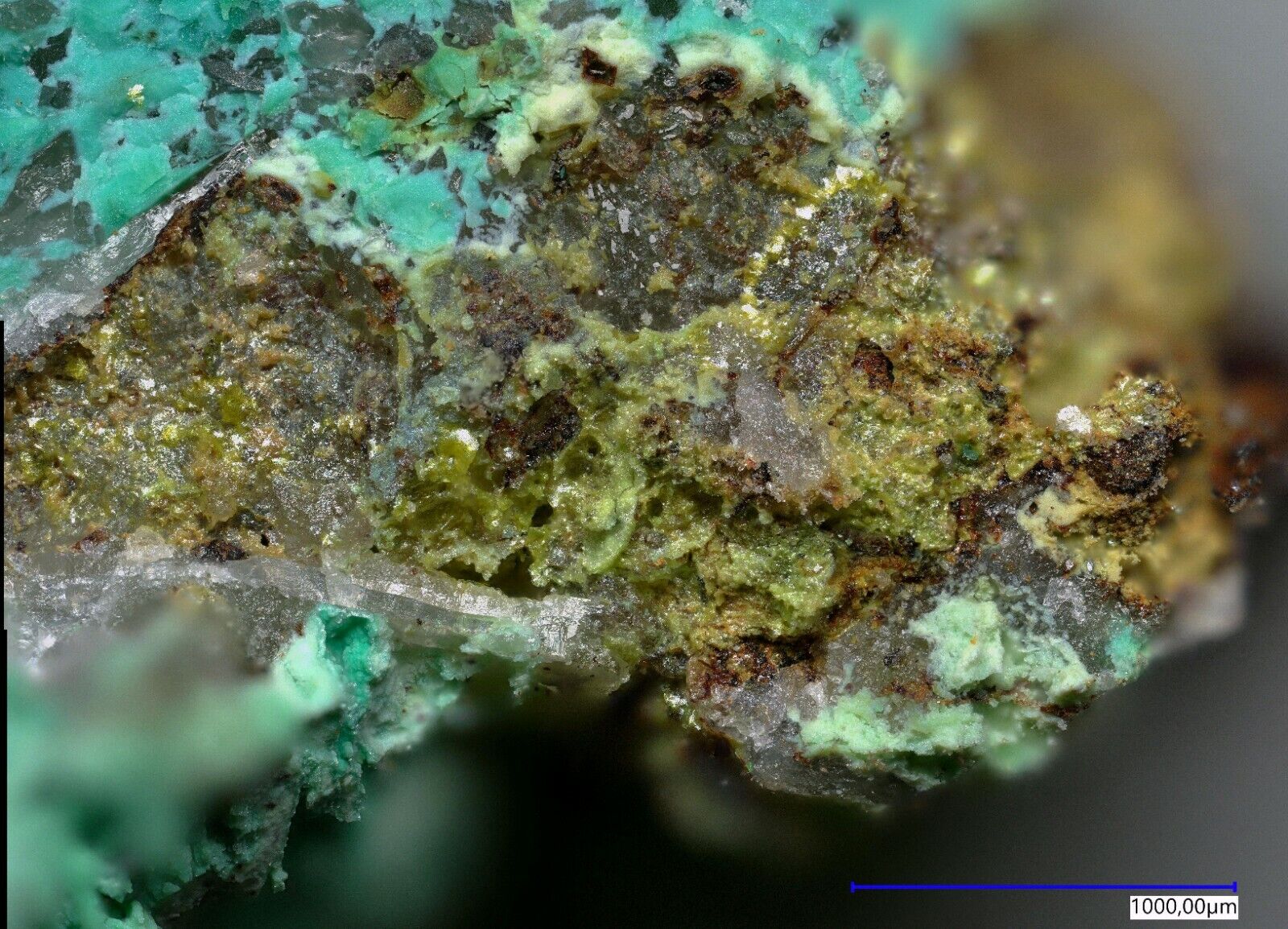 Yellow leisingite on quartz from the North Star mine, Utah, USA. EDS confirmed. Analysis can be sent on request. Specimen size is 2.5 x 2.3 x 0.8 cm
