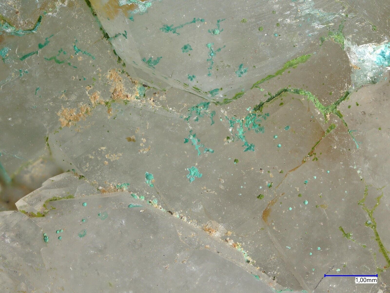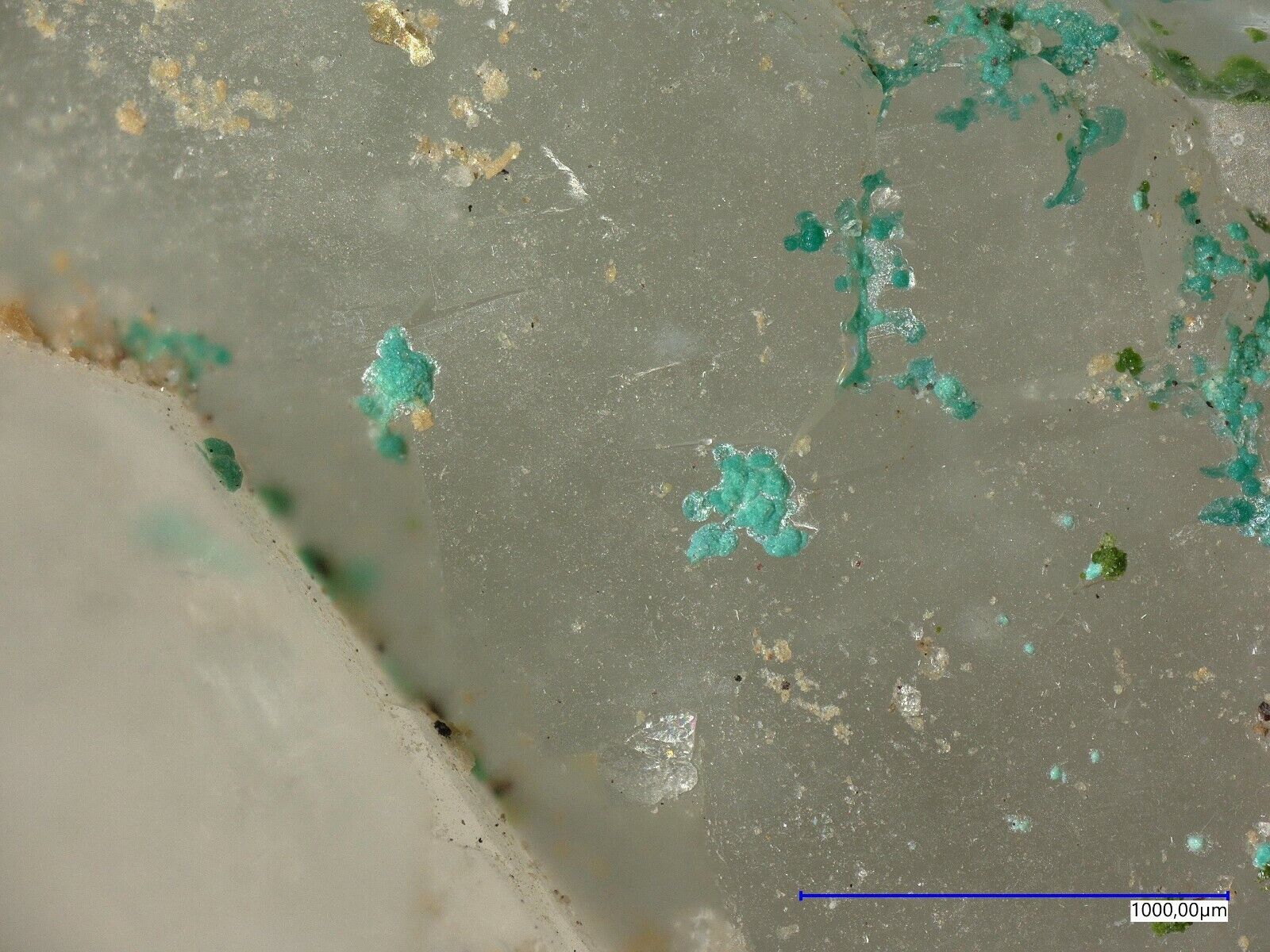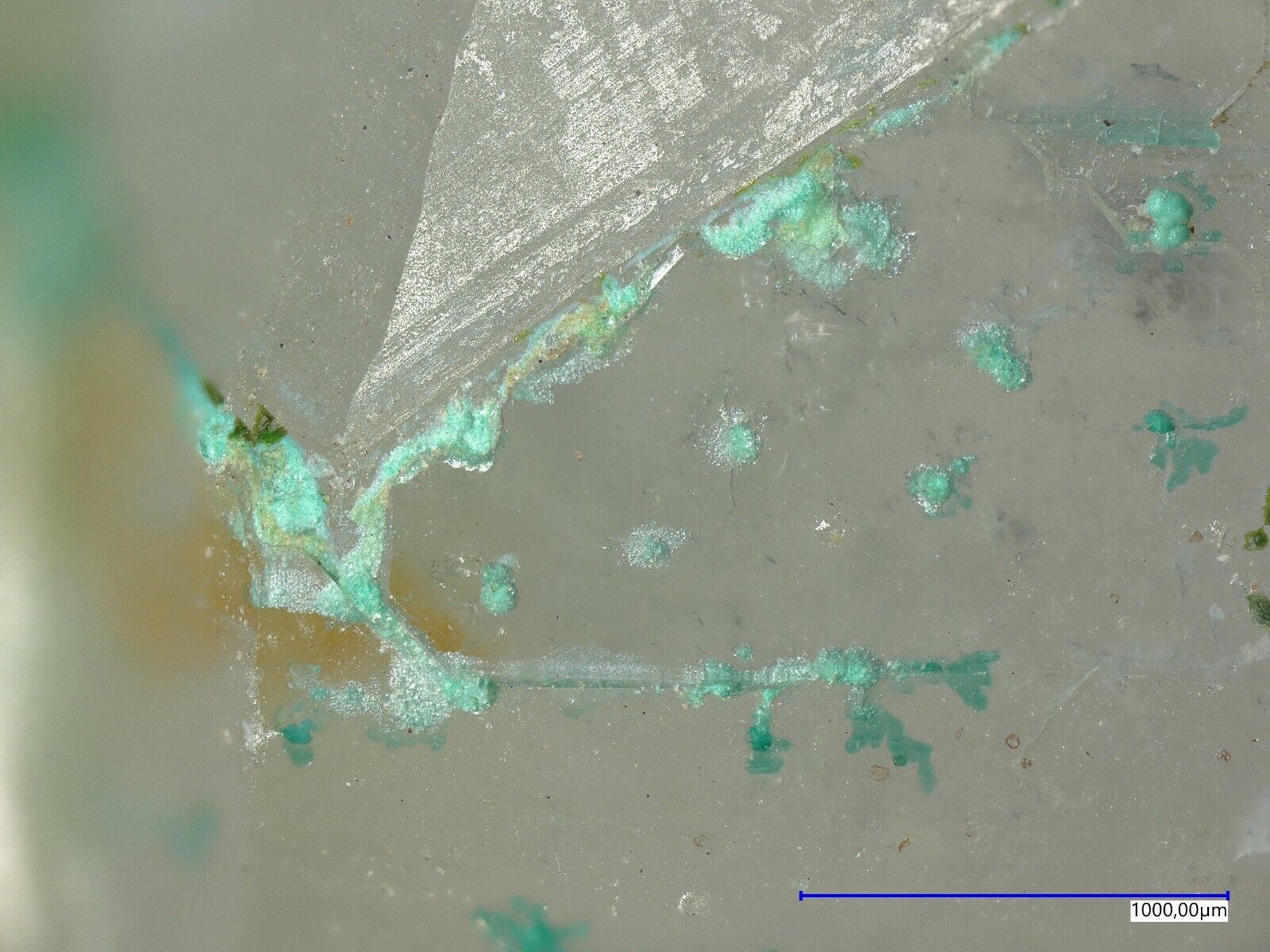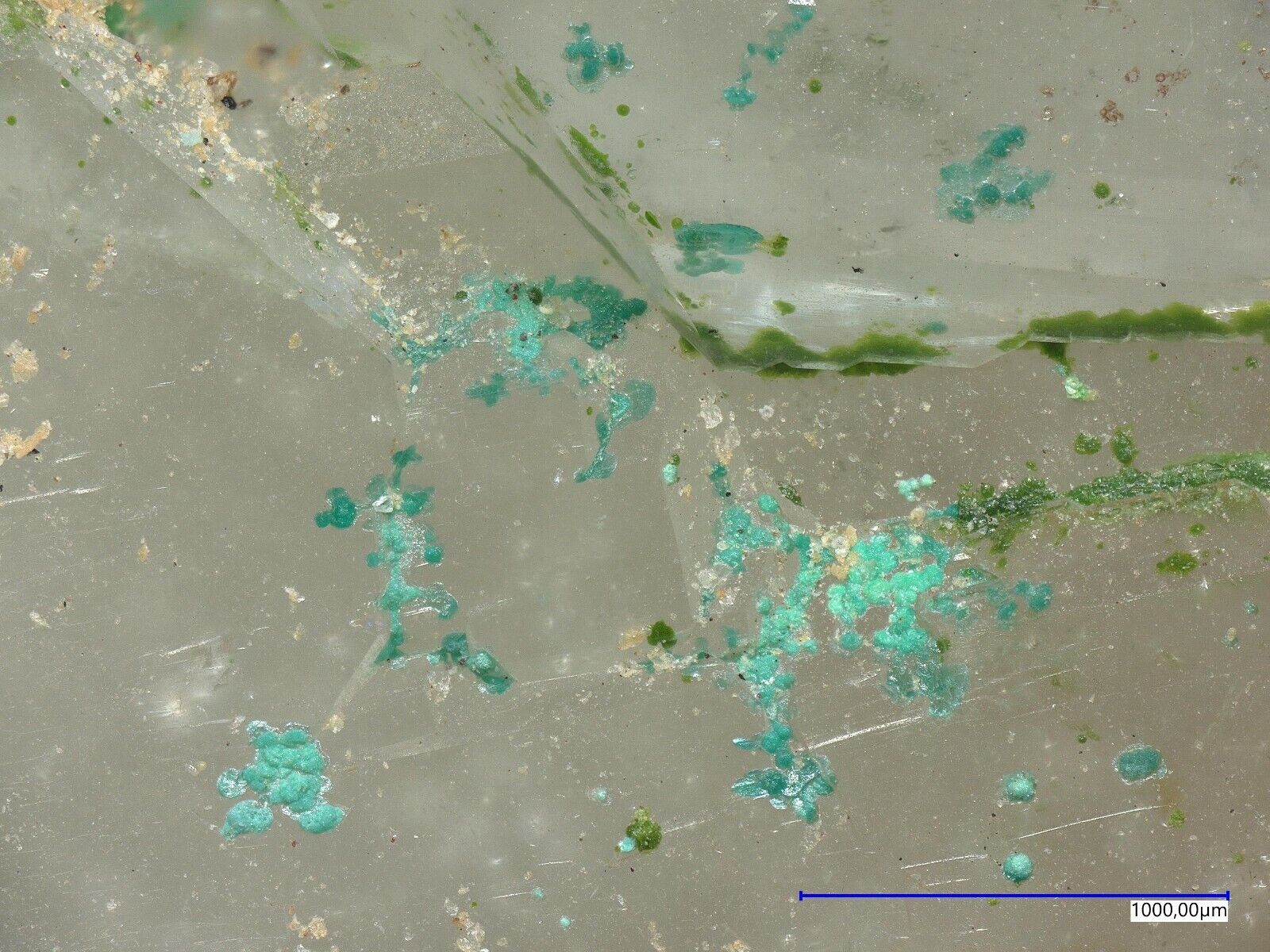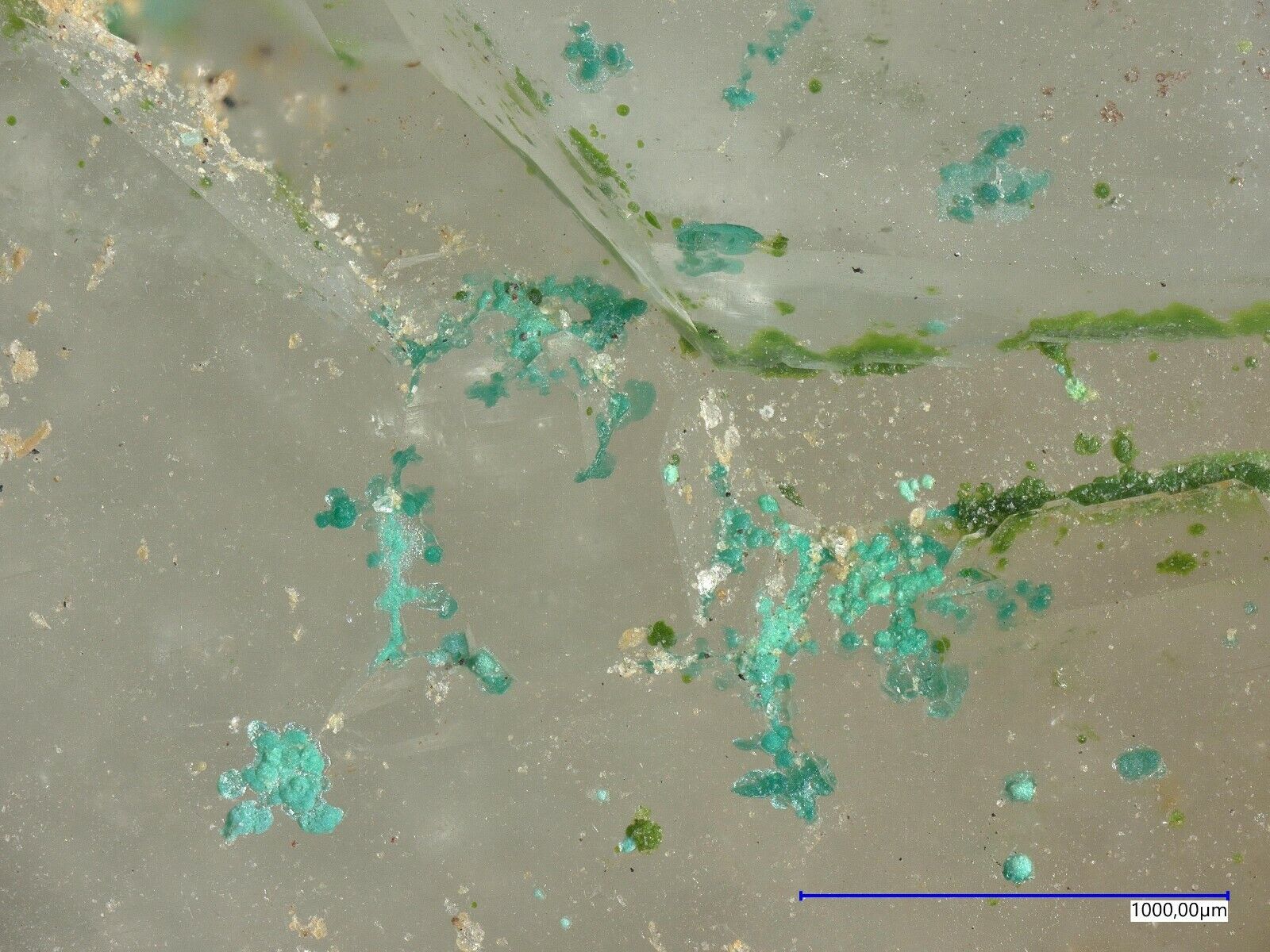 Many pale green mojaveite on quartz from Bird Nest Drift,Otto Mountain, Baker, CA, USA. Specimen size is 3.8 x 2.3 x 1.5 cm