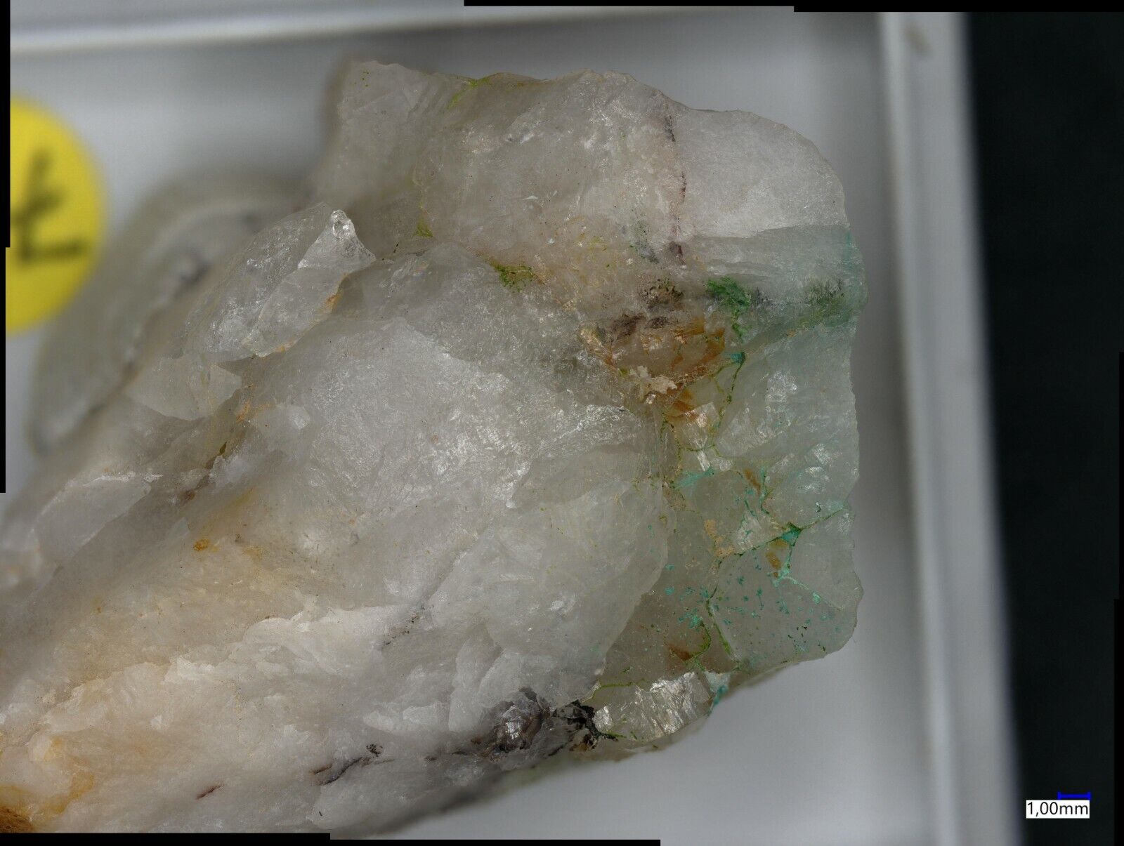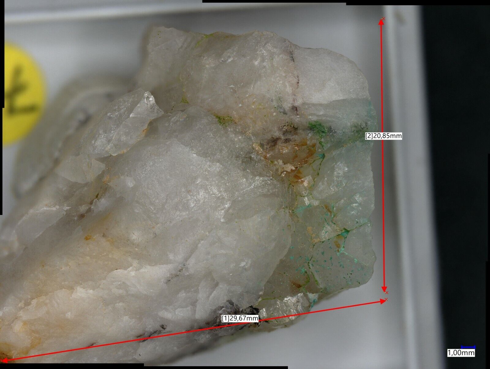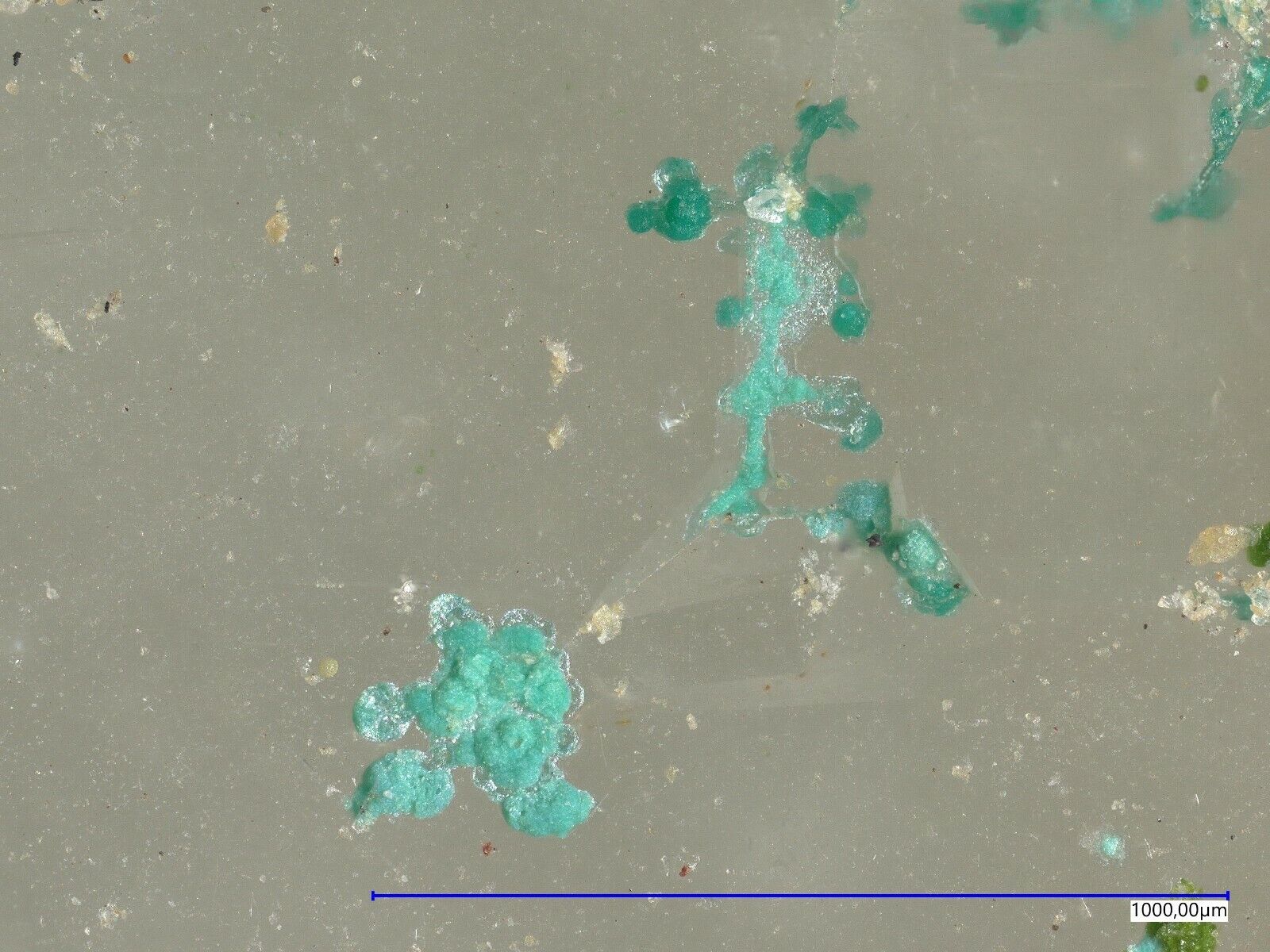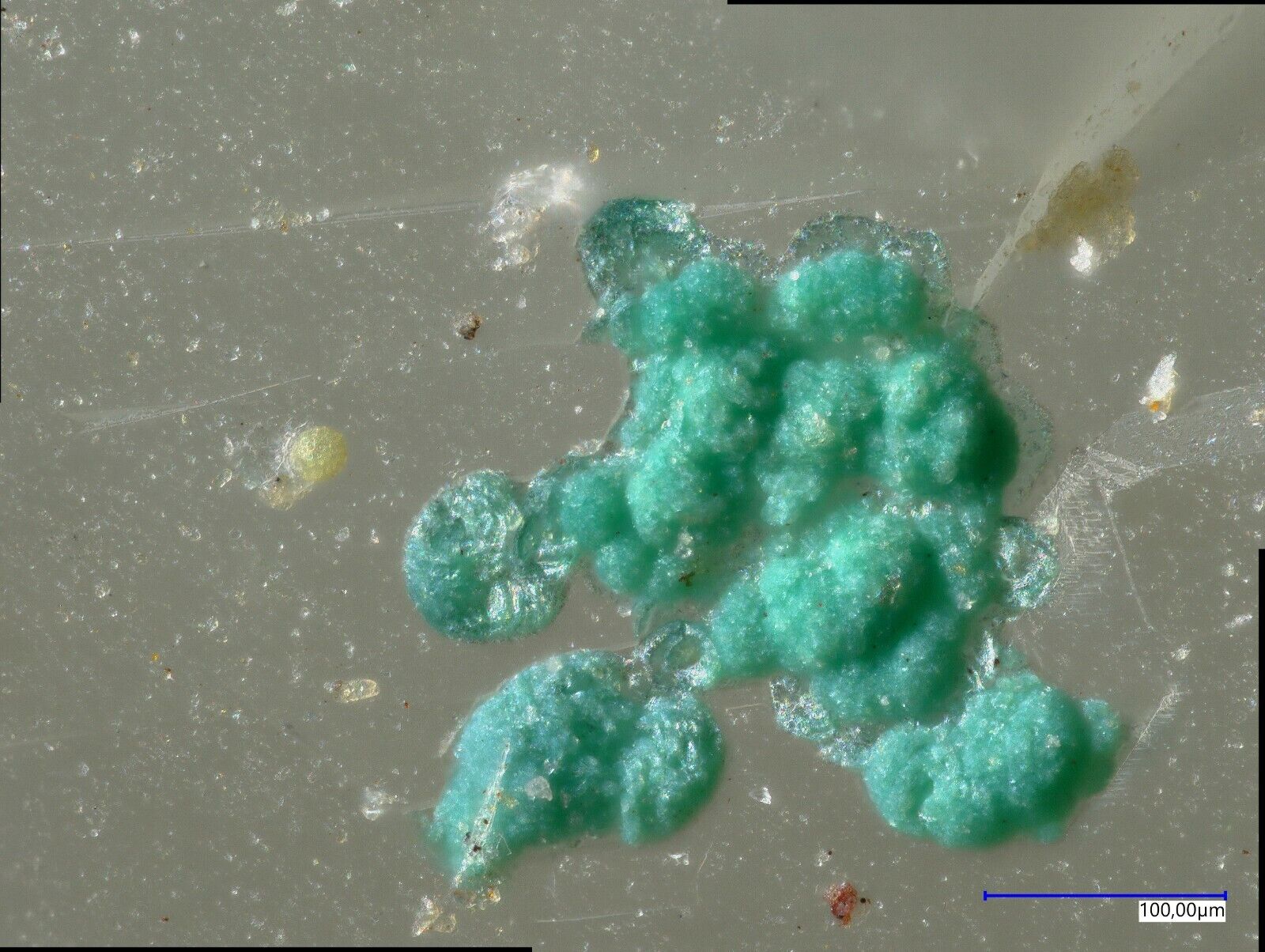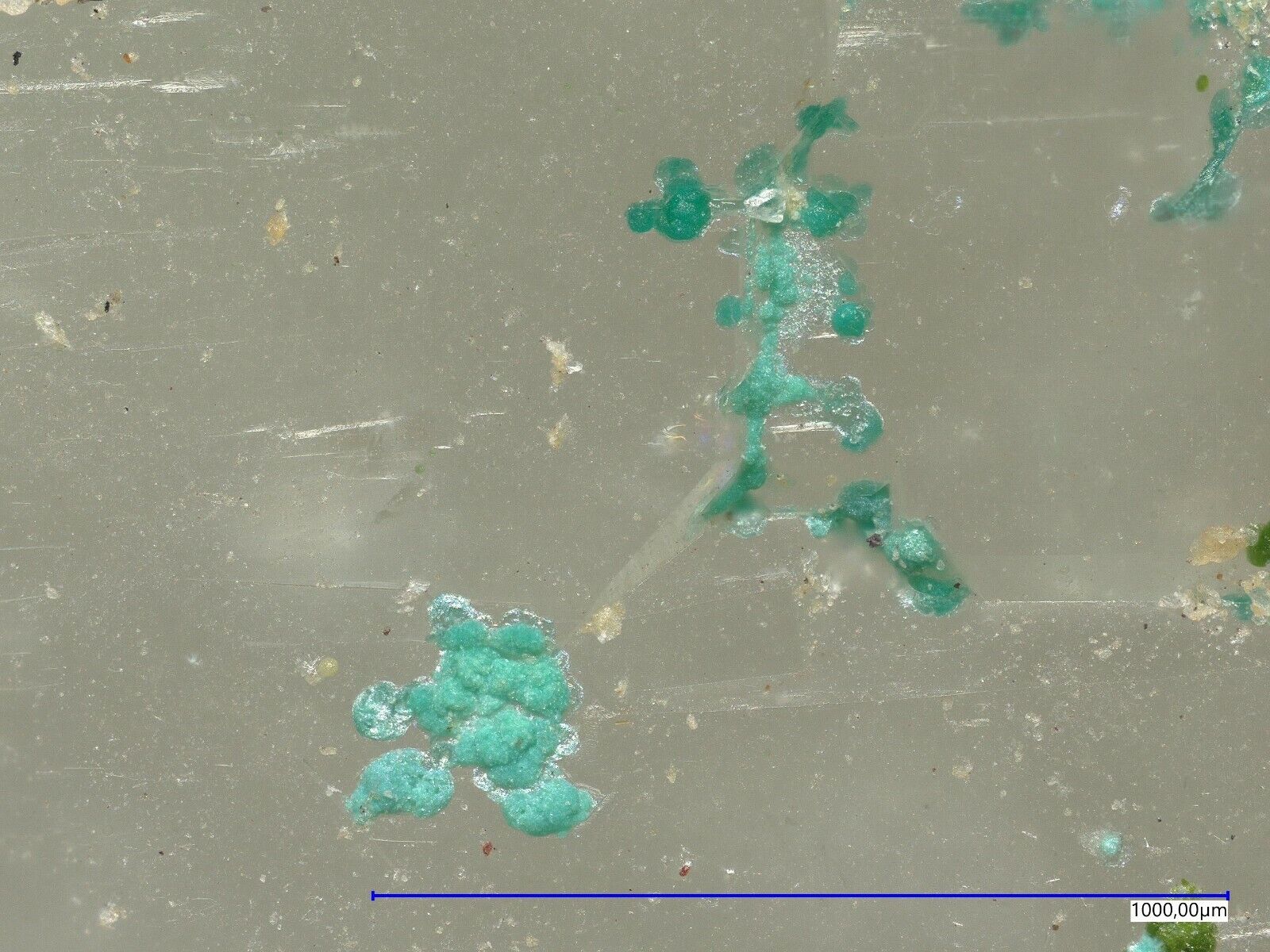 Many pale green mojaveite on quartz from Bird Nest Drift,Otto Mountain, Baker, CA, USA. Specimen size is 3.8 x 2.3 x 1.5 cm