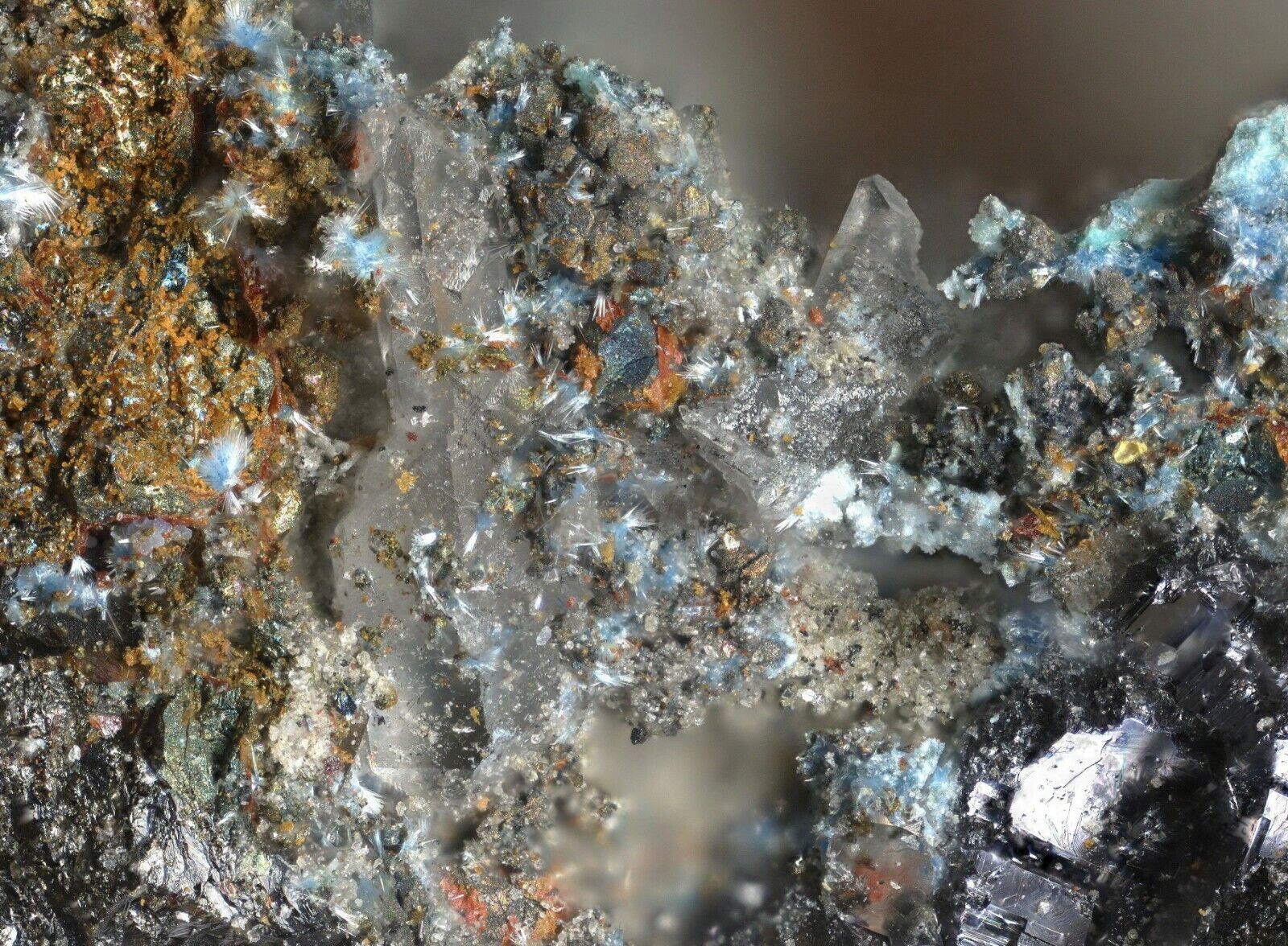 EDX & Raman untersuchter blauer Munakatait mit Cerussit und nadeligem Olsacherit von der Tsumeb mine, Tsumeb, Namibia. EDX & Raman untersucht Nr 722. Analyse auf Anfrage. Größe:1.4 x 1.3 x 0.8 cm