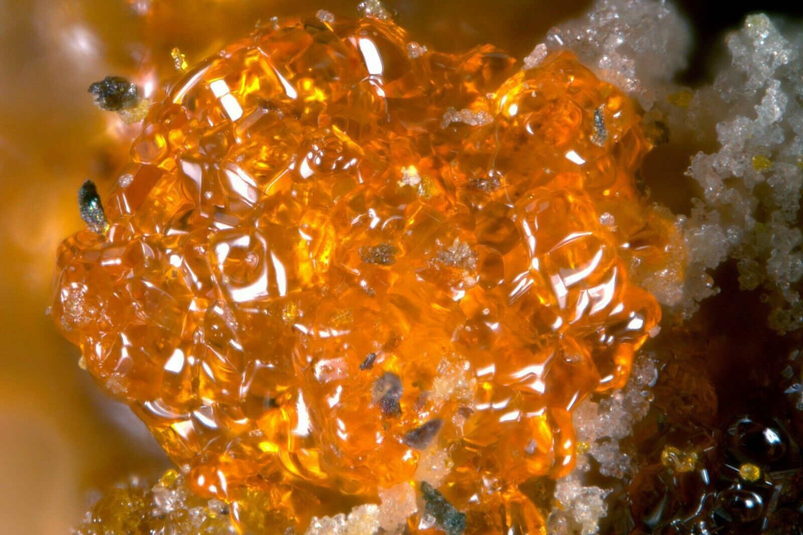 Rich specimen hosting intense orange okieite on yellow lasalite in crystals. Specimen size is