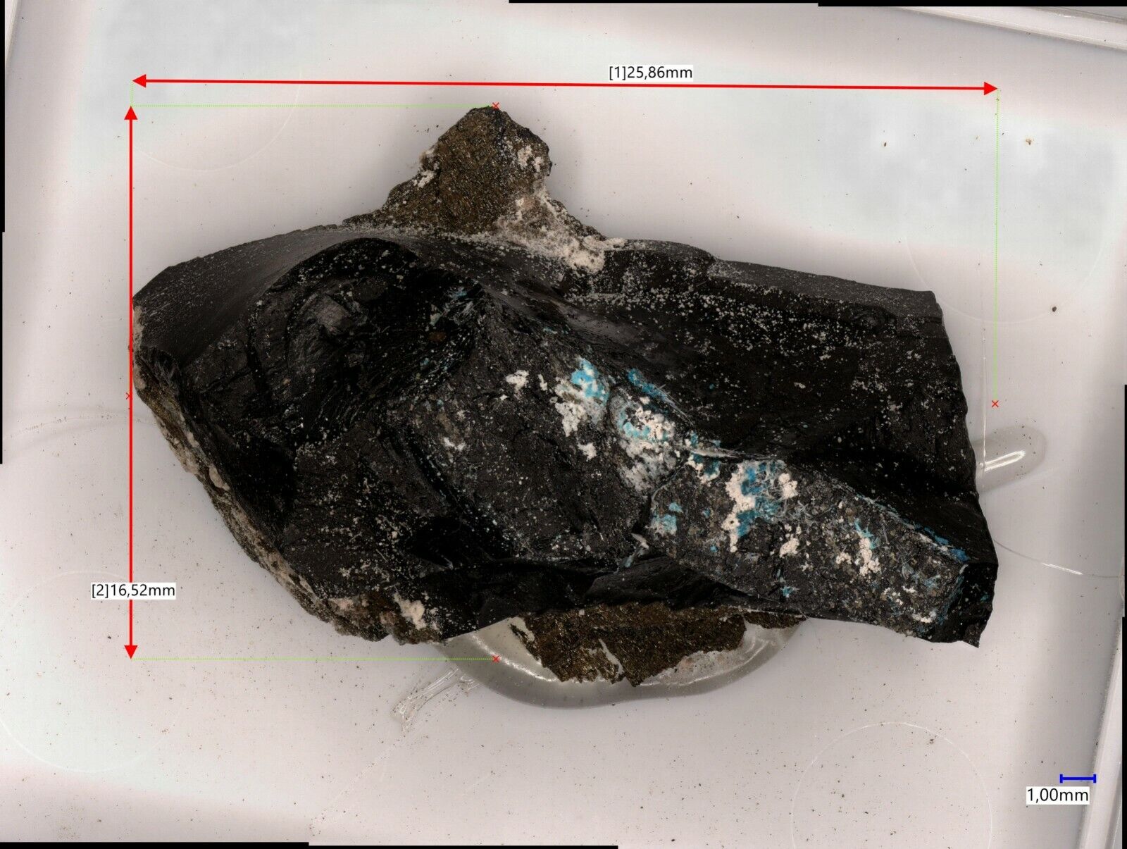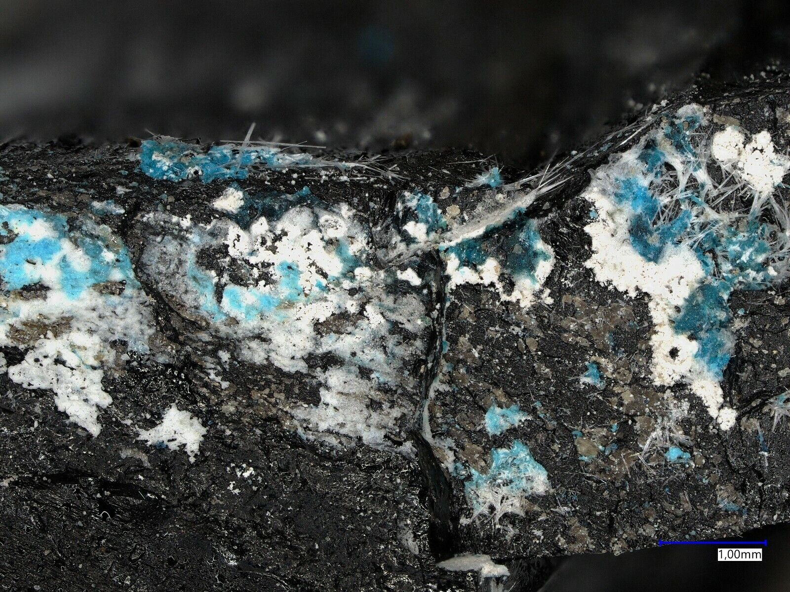 Blaue mehrphasige Aggregate bestehend aus Orthominasragrit, Bobjonesit und der höchsten Hydratisierungsstufe Stanleyit. PXRD untersuchtes Material Nr 02-021-2. Analyse kann auf Anfrage gesendet werden.