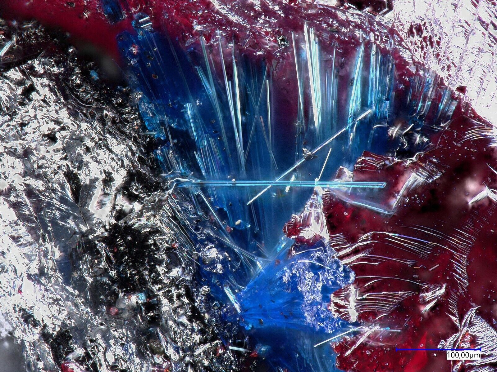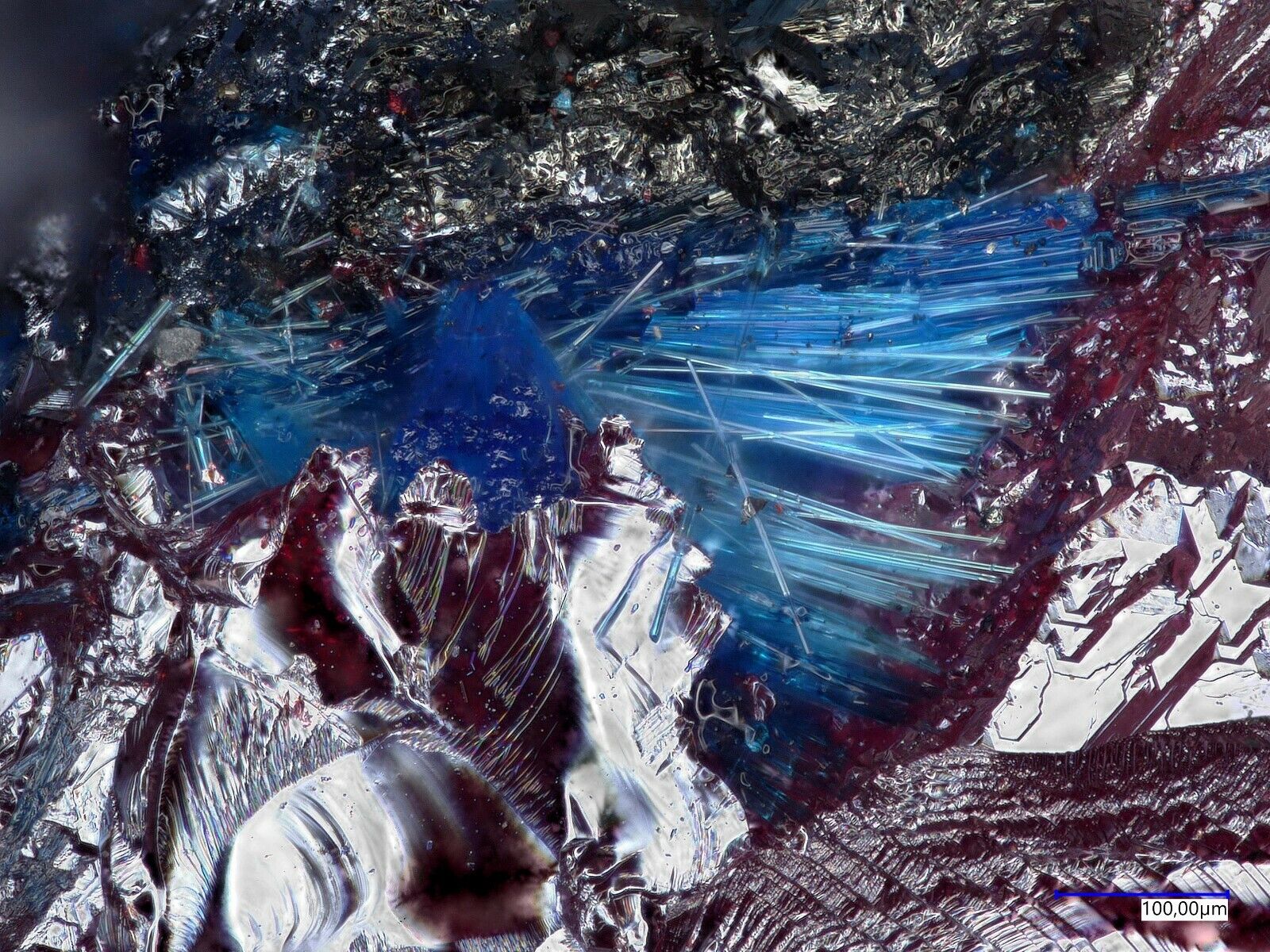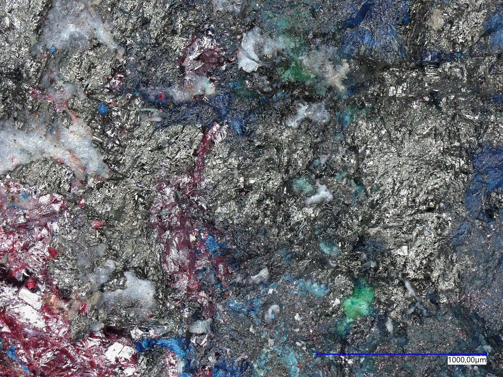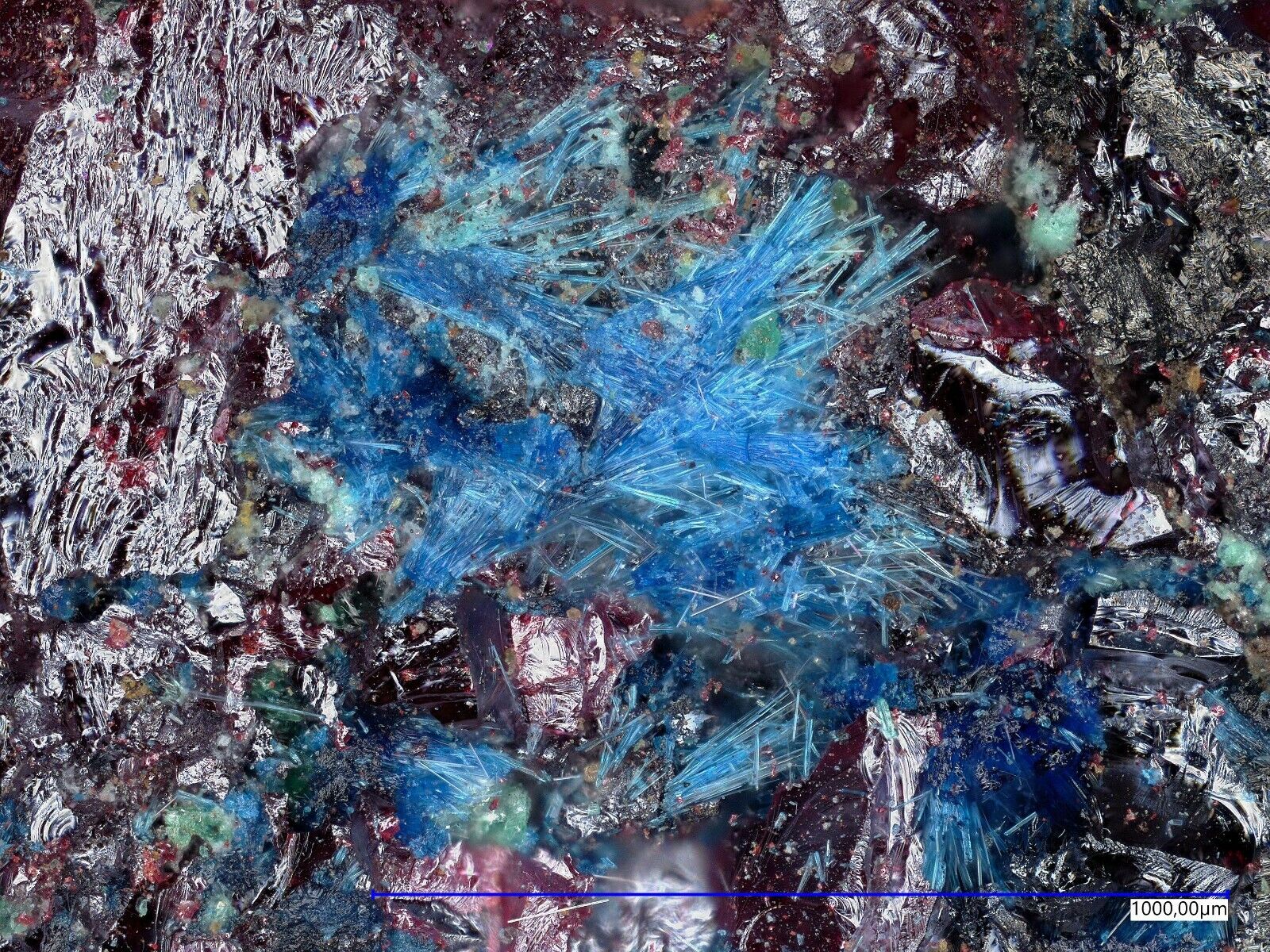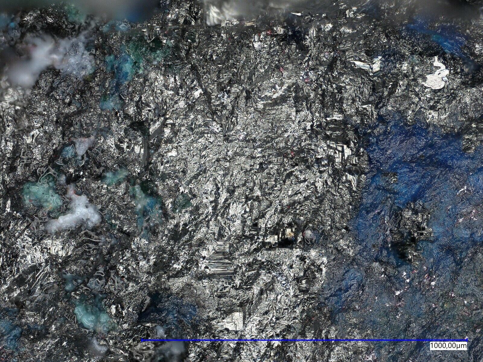 Graumetallische Paramelaconit xx und hellblaue strahlige Likasit xx von Tenke, Tenke-Fungurume, Kolwezi, Lualaba, DR Kongo; 20 x 15 x 7 mm;