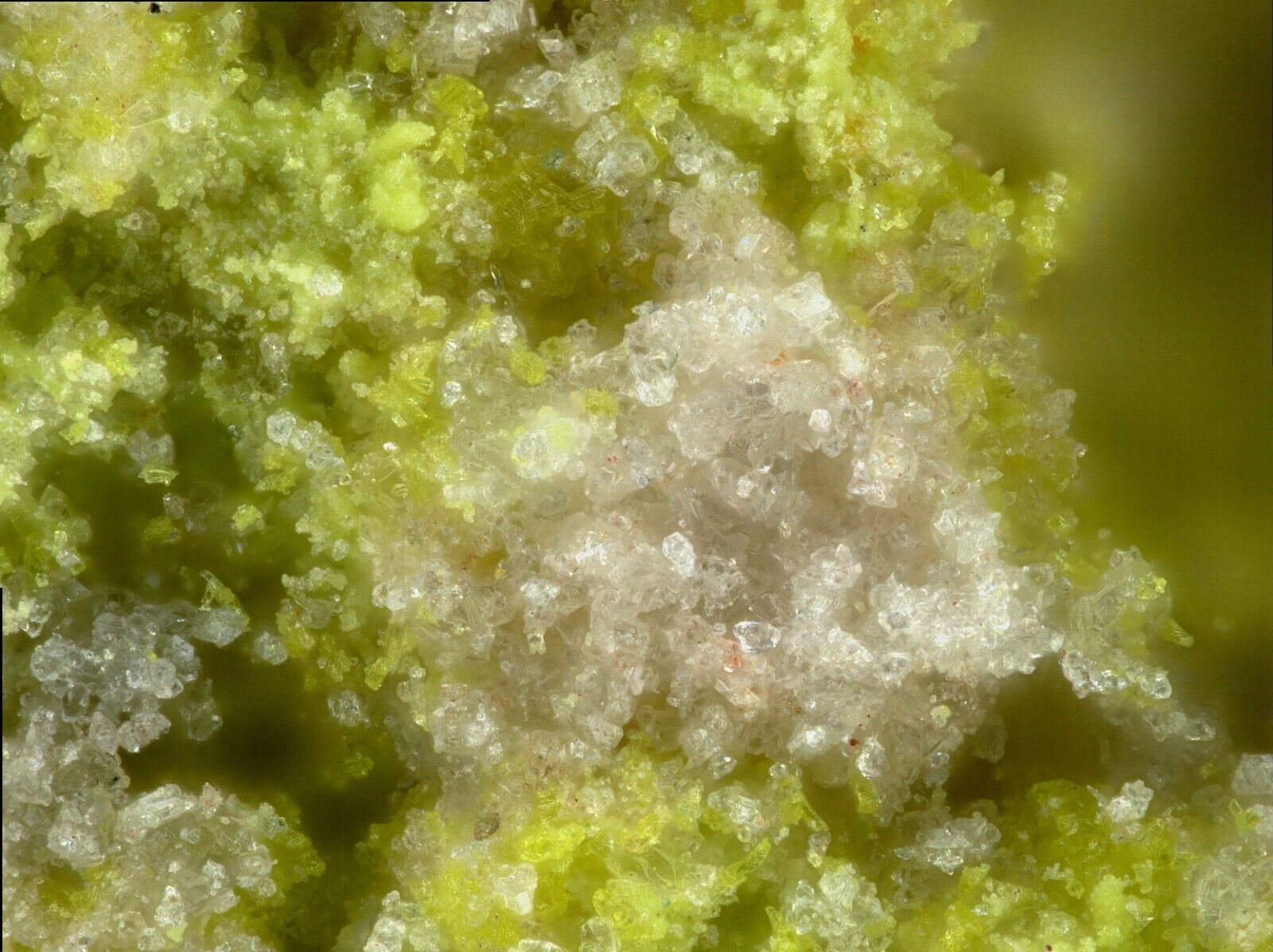 Yellow gartrellite associated with colourless SEM-EDS confirmed philipsbornite and Zn olivenite from the famous Tsumeb mine, Tsumeb, Namibia. Analysis no 1070 (EDS). Specimen comes with a printed analysis