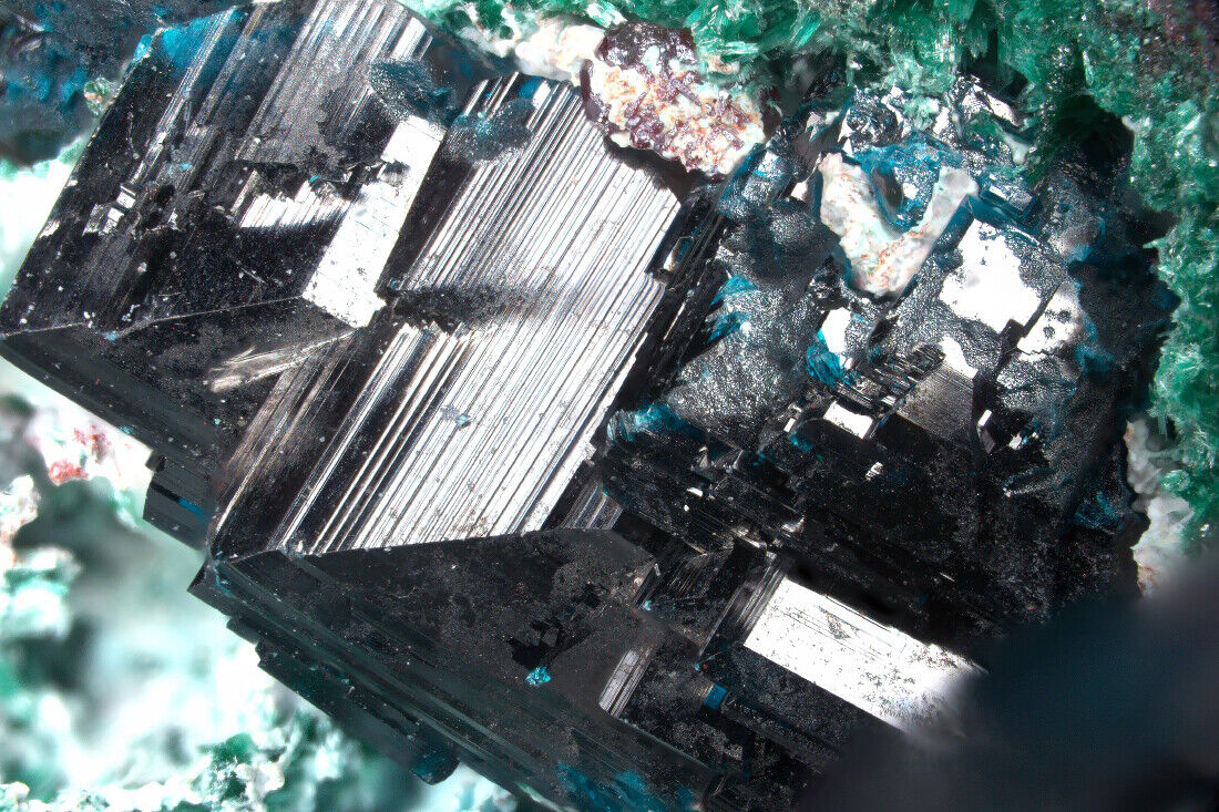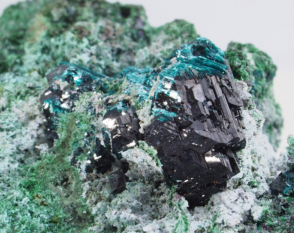 Mehrere größere Rouait Kristallgruppen auf Malachit Cuprit Matrix. Tenke deposit, Kolwezi, Congo