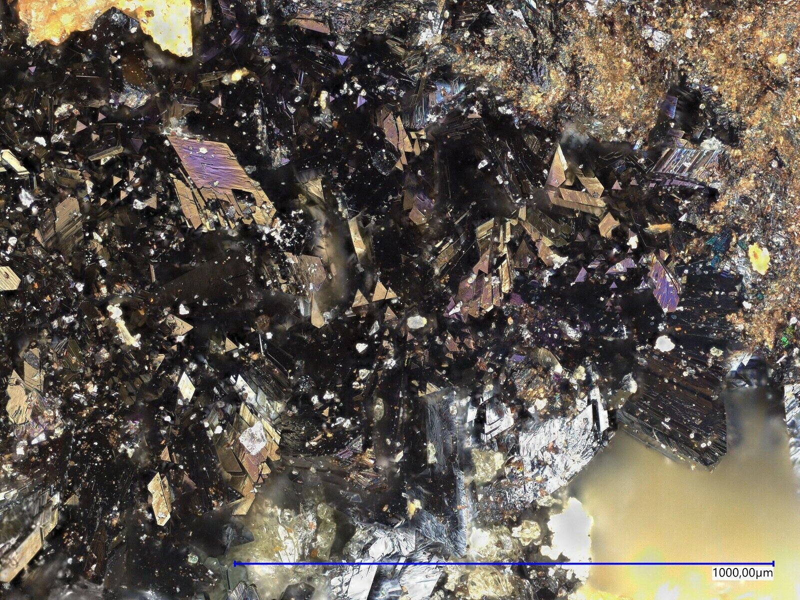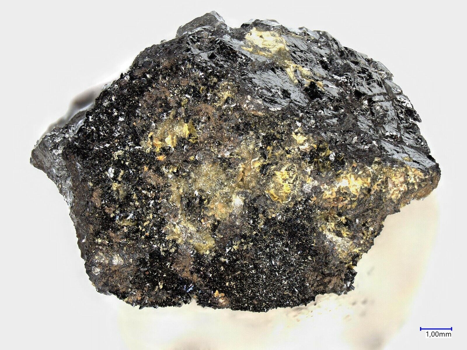 Black EDS & Raman confirmed black schneiderhöhnite with scorodite (yellow) from the Urucum Claim, Galileia, Minas Gerais, Brazil. Raman & EDS analysed. Specimen size is 1.4 x 1.3 x 0.9 cm