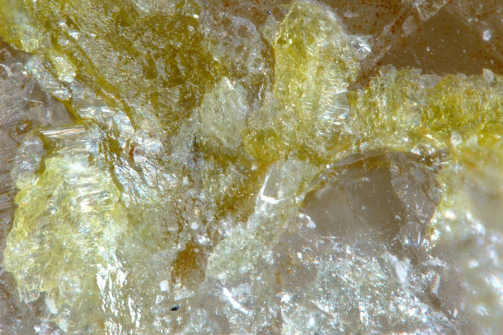 Gelbe Thorneit-Aggregate in Quartz mit Limonit, etwas Ottoit von Bird Nest Drift, California, USA 3.0 x 1.3 x 1.0 cm