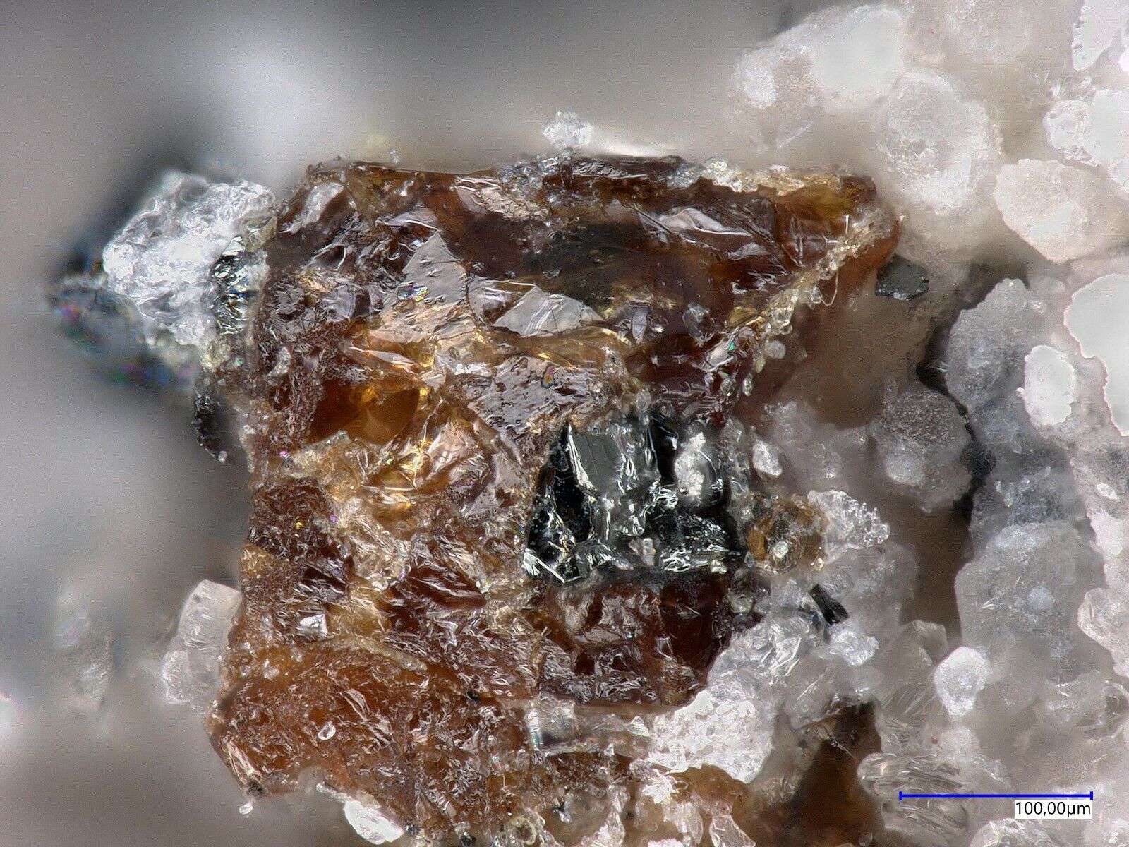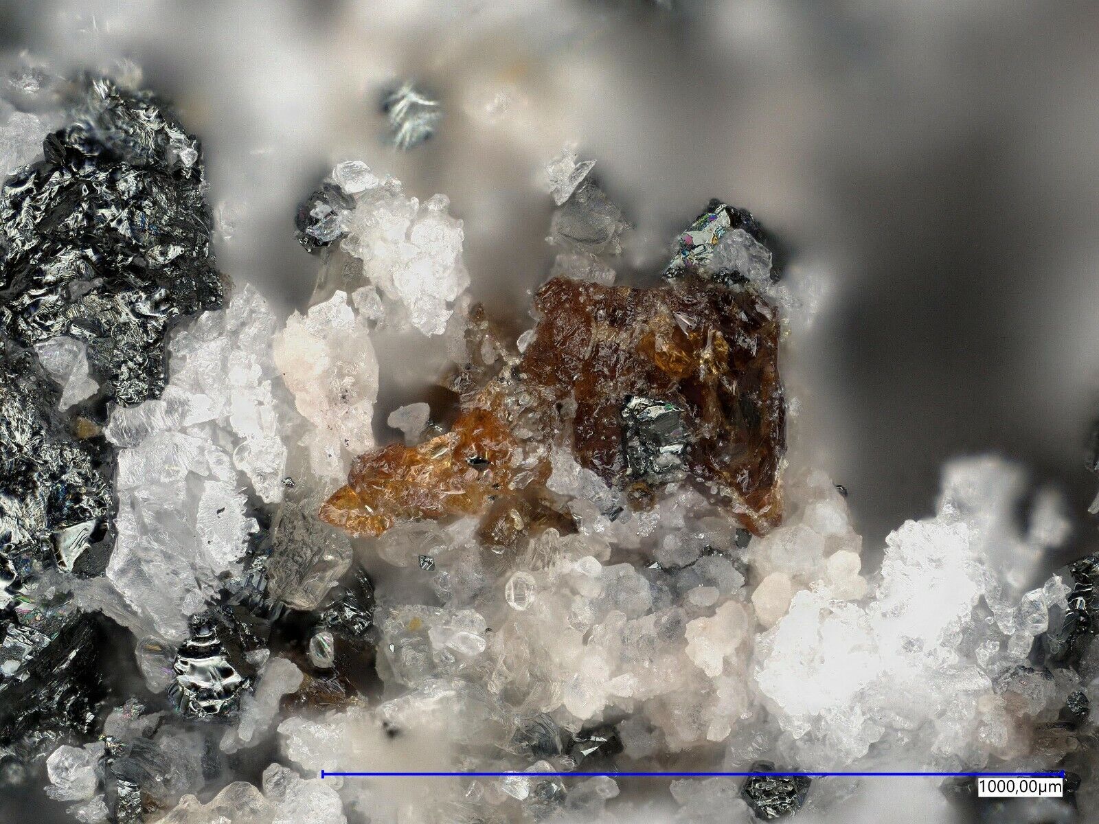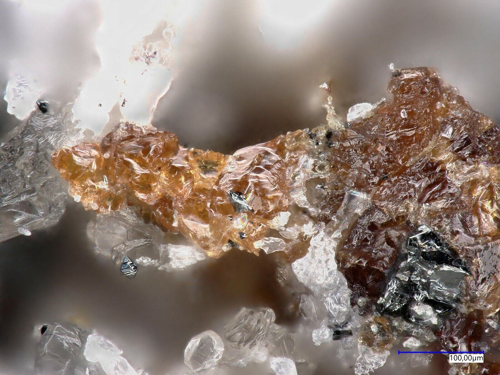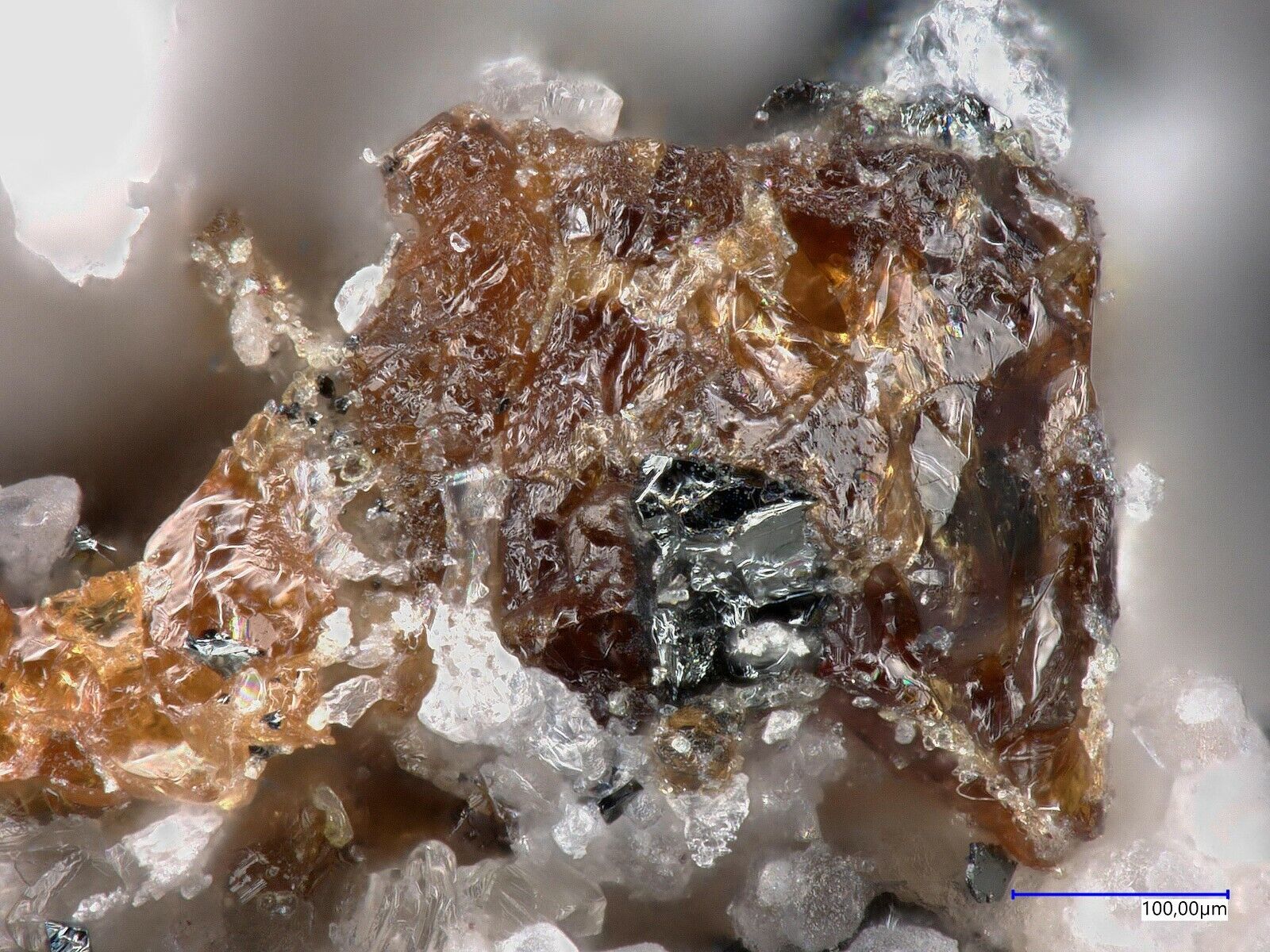 Braun-orange Welshit-Körner in Matrix von Langban, Filipstad, Schweden, EDX untersucht Nr 278 . Analyse auf Anfrage. Größe: 1.7 x 1.3 x 1.2 cm